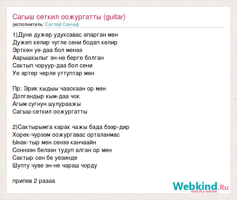 1)Дуне дужер удуксавас апарган мен Дужеп келир чугле сени бодап келир Эрткен уе-даа бол менээ Аарышкылыг эн-не берге болган Сактып чоруур-даа бол сени Уе эртер черле уттуптар мен Пр: Эрик кыдыы чааскаан ор мен Долгандыр кым-даа чок Агым сугнун шулураажы Сагыш-сеткил оожургатты 2)Сактырымга карак чажы бада бээр-дир Хорек-чурээм оожургавас орталанмас Ынак-тыр мен сенээ канчаайн Соннээн белээн тудуп алган ор мен Сактыр сен бе уезинде Шупту чуве эн-не чараш чорду припев 2 разаа