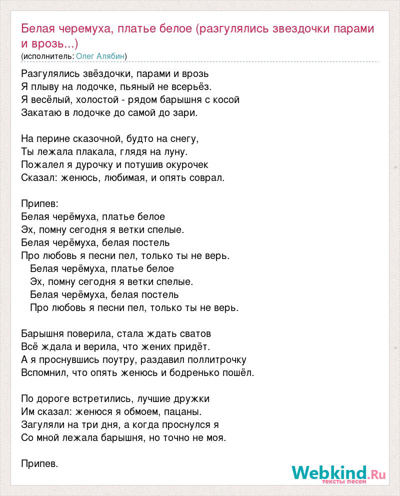 Разгулялись звёздочки, парами и врозь Я плыву на лодочке, пьяный не всерьёз. Я весёлый, холостой - рядом барышня с косой Закатаю в лодочке до самой до зари. На перине сказочной, будто на снегу, Ты лежала плакала, глядя на луну. Пожалел я дурочку и потушив окурочек Сказал: женюсь, любимая, и опять соврал. Припев: Белая черёмуха, платье белое Эх, помну сегодня я ветки спелые. Белая черёмуха, белая постель Про любовь я песни пел, только ты не верь. Белая черёмуха, платье белое Эх, помну сегодня я ветки спелые. Белая черёмуха, белая постель Про любовь я песни пел, только ты не верь. Барышня поверила, стала ждать сватов Всё ждала и верила, что жених придёт. А я проснувшись поутру, раздавил поллитрочку Вспомнил, что опять женюсь и бодренько пошёл. По дороге встретились, лучшие дружки Им сказал: женюся я обмоем, пацаны. Загуляли на три дня, а когда проснулся я Со мной лежала барышня, но точно не моя. Припев.