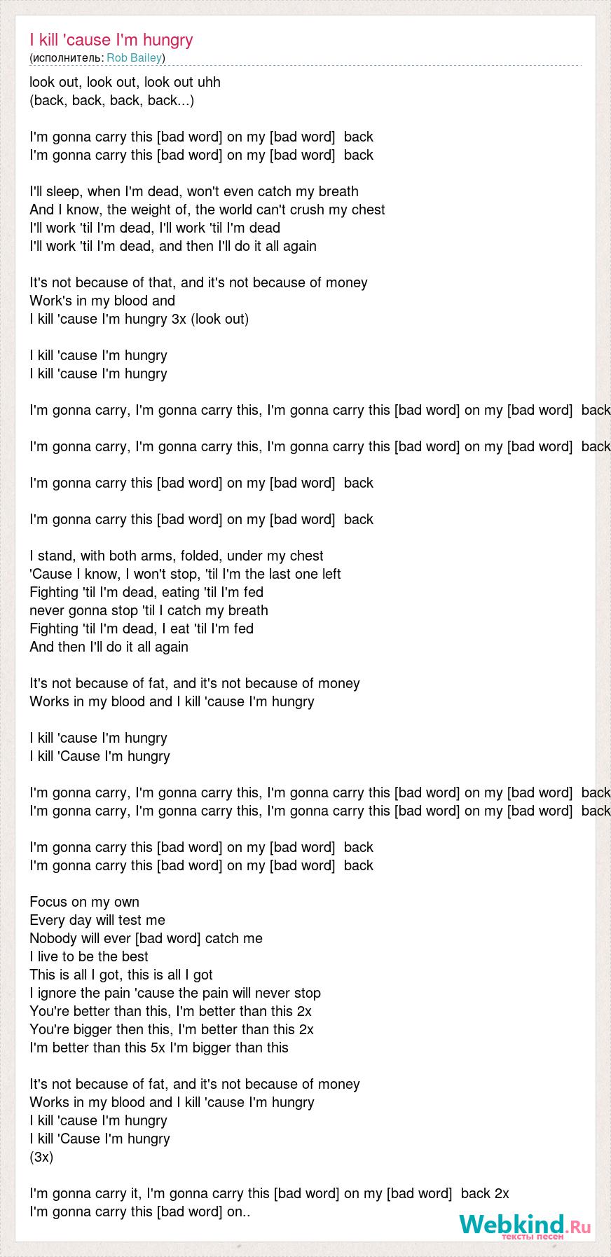 look out, look out, look out uhh (back, back, back, back...) I'm gonna carry this [bad word] on my [bad word] back I'm gonna carry this [bad word] on my [bad word] back I'll sleep, when I'm dead, won't even catch my breath And I know, the weight of, the world can't crush my chest I'll work 'til I'm dead, I'll work 'til I'm dead I'll work 'til I'm dead, and then I'll do it all again It's not because of that, and it's not because of money Work's in my blood and I kill 'cause I'm hungry 3x (look out) I kill 'cause I'm hungry I kill 'cause I'm hungry I'm gonna carry, I'm gonna carry this, I'm gonna carry this [bad word] on my [bad word] back I'm gonna carry, I'm gonna carry this, I'm gonna carry this [bad word] on my [bad word] back I'm gonna carry this [bad word] on my [bad word] back I'm gonna carry this [bad word] on my [bad word] back I stand, with both arms, folded, under my chest 'Cause I know, I won't stop, 'til I'm the last one left Fighting 'til I'm dead, eating 'til I'm fed never gonna stop 'til I catch my breath Fighting 'til I'm dead, I eat 'til I'm fed And then I'll do it all again It's not because of fat, and it's not because of money Works in my blood and I kill 'cause I'm hungry I kill 'cause I'm hungry I kill 'Cause I'm hungry I'm gonna carry, I'm gonna carry this, I'm gonna carry this [bad word] on my [bad word] back I'm gonna carry, I'm gonna carry this, I'm gonna carry this [bad word] on my [bad word] back I'm gonna carry this [bad word] on my [bad word] back I'm gonna carry this [bad word] on my [bad word] back Focus on my own Every day will test me Nobody will ever [bad word] catch me I live to be the best This is all I got, this is all I got I ignore the pain 'cause the pain will never stop You're better than this, I'm better than this 2x You're bigger then this, I'm better than this 2x I'm better than this 5x I'm bigger than this It's not because of fat, and it's not because of money Works in my blood and I kill 'cause I'm hungry I kill 'cause I'm hungry I kill 'Cause I'm hungry (3x) I'm gonna carry it, I'm gonna carry this [bad word] on my [bad word] back 2x I'm gonna carry this [bad word] on..