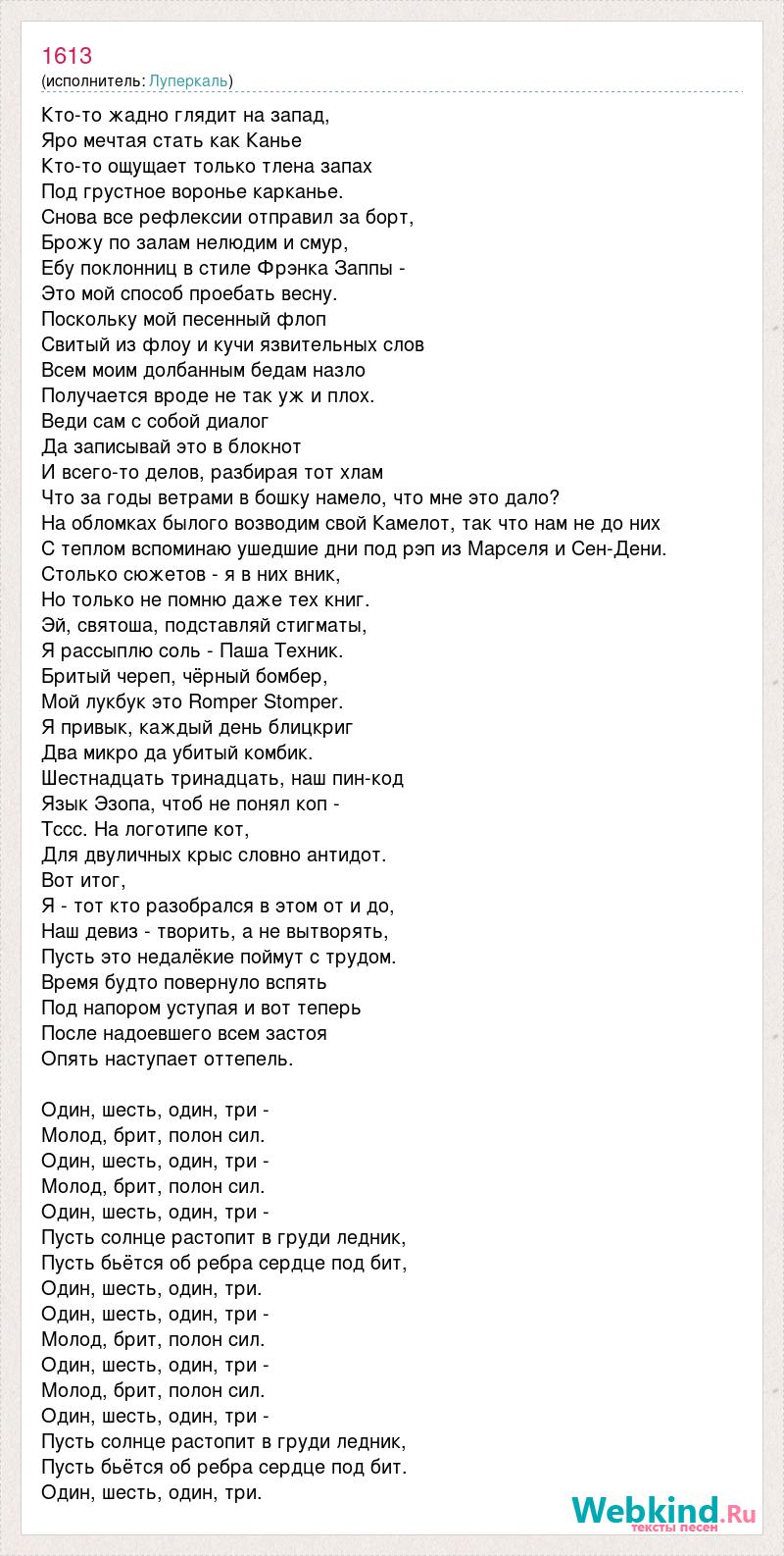 Кто-то жадно глядит на запад, Яро мечтая стать как Канье Кто-то ощущает только тлена запах Под грустное воронье карканье. Снова все рефлексии отправил за борт, Брожу по залам нелюдим и смур, Ебу поклонниц в стиле Фрэнка Заппы - Это мой способ проебать весну. Поскольку мой песенный флоп Свитый из флоу и кучи язвительных слов Всем моим долбанным бедам назло Получается вроде не так уж и плох. Веди сам с собой диалог Да записывай это в блокнот И всего-то делов, разбирая тот хлам Что за годы ветрами в бошку намело, что мне это дало? На обломках былого возводим свой Камелот, так что нам не до них С теплом вспоминаю ушедшие дни под рэп из Марселя и Сен-Дени. Столько сюжетов - я в них вник, Но только не помню даже тех книг. Эй, святоша, подставляй стигматы, Я рассыплю соль - Паша Техник. Бритый череп, чёрный бомбер, Мой лукбук это Romper Stomper. Я привык, каждый день блицкриг Два микро да убитый комбик. Шестнадцать тринадцать, наш пин-код Язык Эзопа, чтоб не понял коп - Тссс. На логотипе кот, Для двуличных крыс словно антидот. Вот итог, Я - тот кто разобрался в этом от и до, Наш девиз - творить, а не вытворять, Пусть это недалёкие поймут с трудом. Время будто повернуло вспять Под напором уступая и вот теперь После надоевшего всем застоя Опять наступает оттепель. Один, шесть, один, три - Молод, брит, полон сил. Один, шесть, один, три - Молод, брит, полон сил. Один, шесть, один, три - Пусть солнце растопит в груди ледник, Пусть бьётся об ребра сердце под бит, Один, шесть, один, три. Один, шесть, один, три - Молод, брит, полон сил. Один, шесть, один, три - Молод, брит, полон сил. Один, шесть, один, три - Пусть солнце растопит в груди ледник, Пусть бьётся об ребра сердце под бит. Один, шесть, один, три.