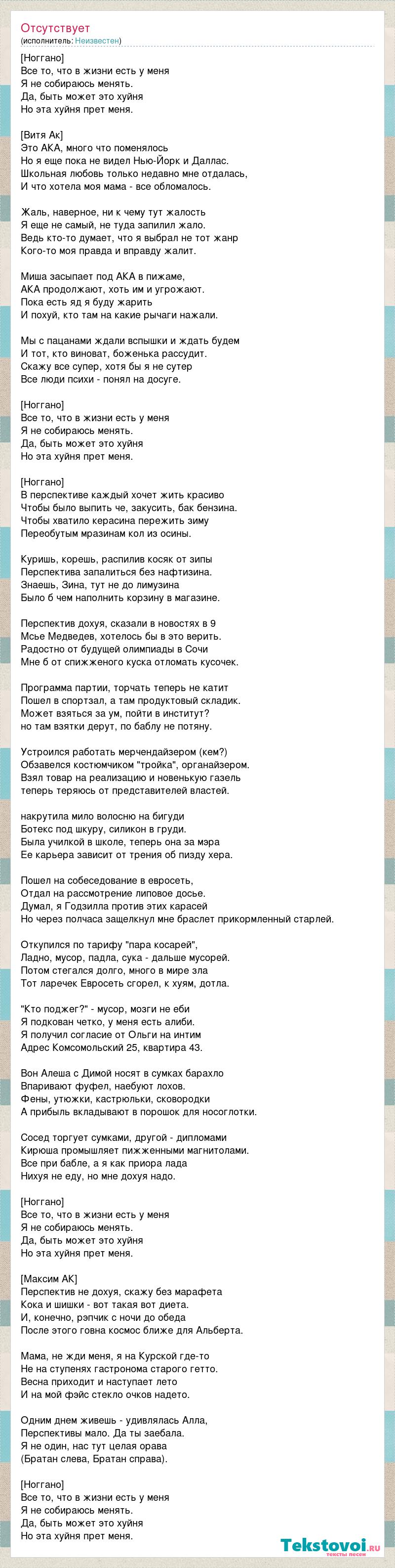[Ноггано] Все то, что в жизни есть у меня Я не собираюсь менять. Да, быть может это хуйня Но эта хуйня прет меня. [Витя Ак] Это АКА, много что поменялось Но я еще пока не видел Нью-Йорк и Даллас. Школьная любовь только недавно мне отдалась, И что хотела моя мама - все обломалось. Жаль, наверное, ни к чему тут жалость Я еще не самый, не туда запилил жало. Ведь кто-то думает, что я выбрал не тот жанр Кого-то моя правда и вправду жалит. Миша засыпает под АКА в пижаме, АКА продолжают, хоть им и угрожают. Пока есть яд я буду жарить И похуй, кто там на какие рычаги нажали. Мы с пацанами ждали вспышки и ждать будем И тот, кто виноват, боженька рассудит. Скажу все супер, хотя бы я не сутер Все люди психи - понял на досуге. [Ноггано] Все то, что в жизни есть у меня Я не собираюсь менять. Да, быть может это хуйня Но эта хуйня прет меня. [Ноггано] В перспективе каждый хочет жить красиво Чтобы было выпить че, закусить, бак бензина. Чтобы хватило керасина пережить зиму Переобутым мразинам кол из осины. Куришь, корешь, распилив косяк от зипы Перспектива запалиться без нафтизина. Знаешь, Зина, тут не до лимузина Было б чем наполнить корзину в магазине. Перспектив дохуя, сказали в новостях в 9 Мсье Медведев, хотелось бы в это верить. Радостно от будущей олимпиады в Сочи Мне б от спижженого куска отломать кусочек. Программа партии, торчать теперь не катит Пошел в спортзал, а там продуктовый складик. Может взяться за ум, пойти в институт? но там взятки дерут, по баблу не потяну. Устроился работать мерчендайзером (кем?) Обзавелся костюмчиком "тройка", органайзером. Взял товар на реализацию и новенькую газель теперь теряюсь от представителей властей. накрутила мило волосню на бигуди Ботекс под шкуру, силикон в груди. Была училкой в школе, теперь она за мэра Ее карьера зависит от трения об пизду хера. Пошел на собеседование в евросеть, Отдал на рассмотрение липовое досье. Думал, я Годзилла против этих карасей Но через полчаса защелкнул мне браслет прикормленный старлей. Откупился по тарифу "пара косарей", Ладно, мусор, падла, сука - дальше мусорей. Потом стегался долго, много в мире зла Тот ларечек Евросеть сгорел, к хуям, дотла. "Кто поджег?" - мусор, мозги не еби Я подкован четко, у меня есть алиби. Я получил согласие от Ольги на интим Адрес Комсомольский 25, квартира 43. Вон Алеша с Димой носят в сумках барахло Впаривают фуфел, наебуют лохов. Фены, утюжки, кастрюльки, сковородки А прибыль вкладывают в порошок для носоглотки. Сосед торгует сумками, другой - дипломами Кирюша промышляет пижженными магнитолами. Все при бабле, а я как приора лада Нихуя не еду, но мне дохуя надо. [Ноггано] Все то, что в жизни есть у меня Я не собираюсь менять. Да, быть может это хуйня Но эта хуйня прет меня. [Максим АК] Перспектив не дохуя, скажу без марафета Кока и шишки - вот такая вот диета. И, конечно, рэпчик с ночи до обеда После этого говна космос ближе для Альберта. Мама, не жди меня, я на Курской где-то Не на ступенях гастронома старого гетто. Весна приходит и наступает лето И на мой фэйс стекло очков надето. Одним днем живешь - удивлялась Алла, Перспективы мало. Да ты заебала. Я не один, нас тут целая орава (Братан слева, Братан справа). [Ноггано] Все то, что в жизни есть у меня Я не собираюсь менять. Да, быть может это хуйня Но эта хуйня прет меня.