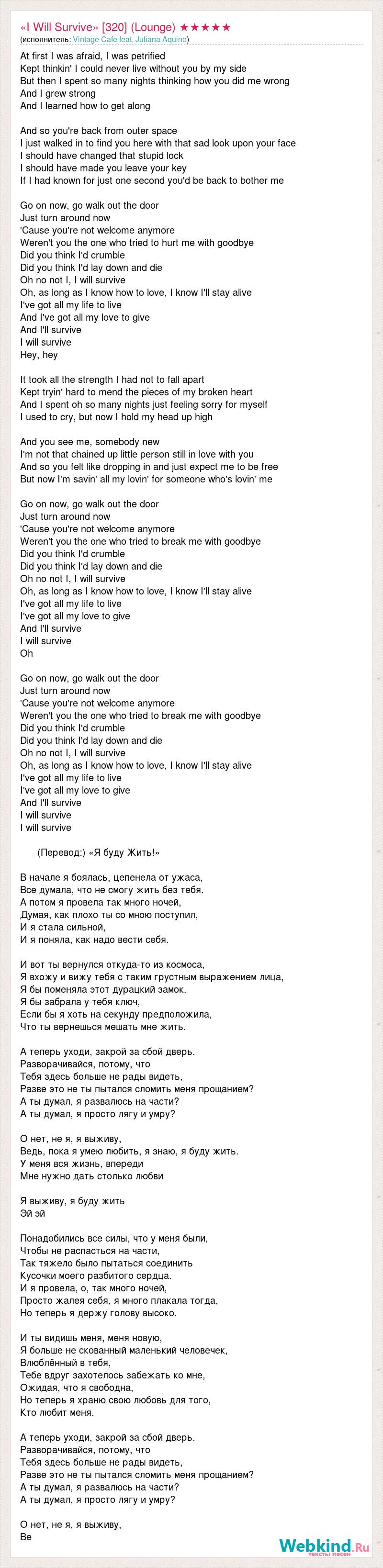 At first I was afraid, I was petrified Kept thinkin' I could never live without you by my side But then I spent so many nights thinking how you did me wrong And I grew strong And I learned how to get along And so you're back from outer space I just walked in to find you here with that sad look upon your face I should have changed that stupid lock I should have made you leave your key If I had known for just one second you'd be back to bother me Go on now, go walk out the door Just turn around now 'Cause you're not welcome anymore Weren't you the one who tried to hurt me with goodbye Did you think I'd crumble Did you think I'd lay down and die Oh no not I, I will survive Oh, as long as I know how to love, I know I'll stay alive I've got all my life to live And I've got all my love to give And I'll survive I will survive Hey, hey It took all the strength I had not to fall apart Kept tryin' hard to mend the pieces of my broken heart And I spent oh so many nights just feeling sorry for myself I used to cry, but now I hold my head up high And you see me, somebody new I'm not that chained up little person still in love with you And so you felt like dropping in and just expect me to be free But now I'm savin' all my lovin' for someone who's lovin' me Go on now, go walk out the door Just turn around now 'Cause you're not welcome anymore Weren't you the one who tried to break me with goodbye Did you think I'd crumble Did you think I'd lay down and die Oh no not I, I will survive Oh, as long as I know how to love, I know I'll stay alive I've got all my life to live I've got all my love to give And I'll survive I will survive Oh Go on now, go walk out the door Just turn around now 'Cause you're not welcome anymore Weren't you the one who tried to break me with goodbye Did you think I'd crumble Did you think I'd lay down and die Oh no not I, I will survive Oh, as long as I know how to love, I know I'll stay alive I've got all my life to live I've got all my love to give And I'll survive I will survive I will survive (Перевод:) «Я буду Жить!» В начале я боялась, цепенела от ужаса, Все думала, что не смогу жить без тебя. А потом я провела так много ночей, Думая, как плохо ты со мною поступил, И я стала сильной, И я поняла, как надо вести себя. И вот ты вернулся откуда-то из космоса, Я вхожу и вижу тебя с таким грустным выражением лица, Я бы поменяла этот дурацкий замок. Я бы забрала у тебя ключ, Если бы я хоть на секунду предположила, Что ты вернешься мешать мне жить. А теперь уходи, закрой за сбой дверь. Разворачивайся, потому, что Тебя здесь больше не рады видеть, Разве это не ты пытался сломить меня прощанием? А ты думал, я развалюсь на части? А ты думал, я просто лягу и умру? О нет, не я, я выживу, Ведь, пока я умею любить, я знаю, я буду жить. У меня вся жизнь, впереди Мне нужно дать столько любви Я выживу, я буду жить Эй эй Понадобились все силы, что у меня были, Чтобы не распасться на части, Так тяжело было пытаться соединить Кусочки моего разбитого сердца. И я провела, о, так много ночей, Просто жалея себя, я много плакала тогда, Но теперь я держу голову высоко. И ты видишь меня, меня новую, Я больше не скованный маленький человечек, Влюблённый в тебя, Тебе вдруг захотелось забежать ко мне, Ожидая, что я свободна, Но теперь я храню свою любовь для того, Кто любит меня. А теперь уходи, закрой за сбой дверь. Разворачивайся, потому, что Тебя здесь больше не рады видеть, Разве это не ты пытался сломить меня прощанием? А ты думал, я развалюсь на части? А ты думал, я просто лягу и умру? О нет, не я, я выживу, Ве