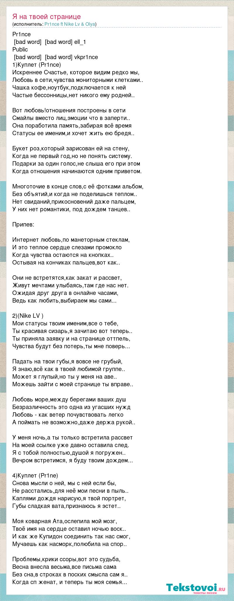 Pr1nce [bad word] [bad word] ell_1 Public [bad word] [bad word] vkpr1nce 1)Куплет (Pr1nce) Искреннее Счастье, которое видим редко мы, Любовь в сети,чувства мониторными клетками.. Чашка кофе,ноутбук,подключается к ней Частые бессонницы,нет никого ему родней.. Вот любовь!отношения построены в сети Смайлы вместо лиц,эмоции что в заперти.. Она поработила память,забирая всё время Статусы ее именим,и хочет жить ею бредя.. Букет роз,который зарисован ей на стену, Когда не первый год,но не понять систему. Подарки за один голос,не слыша его при этом Когда отношения начинаются одним приветом. Многоточие в конце слов,с её фотками альбом, Без объятий,и когда не поделишься теплом.. Нет свиданий,прикосновений даже пальцем, У них нет романтики, под дождем танцев.. Припев: Интернет любовь,по манеторным стеклам, И это теплое сердце слезами промокло Когда чувства остаются на кнопках.. Остывая на кончиках пальцев,вот как.. Они не встретятся,как закат и рассвет, Живут мечтами улыбаясь,там где нас нет. Ожидая друг друга в онлайне часами, Ведь как любить,выбираем мы сами... 2)(Nike LV ) Мои статусы твоим именим,все о тебе, Ты красивая сизарь,я зачитаю вот теперь.. Ты приняла заявку и на странице оттпель, Чувства будут без потерь,ты мне поверь... Падать на твои губы,я вовсе не грубый, Я знаю,всё как в твоей любимой группе.. Может я глупый,но ты у меня на аве.. Можешь зайти с моей странице ты вправе.. Любовь море,между берегами ваших душ Безразличность это одна из угасших нужд Любовь - как ветер почувствовать легко А поймать не возможно,даже держа рукой.. У меня ночь,а ты только встретила рассвет На моей ссылке уже давно оставила след. Я с тобой полностью,душой я погружен.. Вечром встретимся, я буду твоим дождем... 4)Куплет (Pr1ne) Снова мысли о ней, мы с ней если бы, Не расстались,для неё мои песни в пыль.. Каплями дождя нарисую,я твой портрет, Губы сладкая вата,признаюсь я эстет.. Моя коварная Ата,ослепила мой мозг, Твоё имя на сердце оставил ночью воск.. И как же Купидон соединить так нас смог, Мучаешь как насморк,полюбила на спор.. Проблемы,крики ссоры,вот это судьба, Весна внесла весьма,все письма сама Без сна,в строках в поских смысла сам я.. Когда сп женат, и теперь ты моя семья...