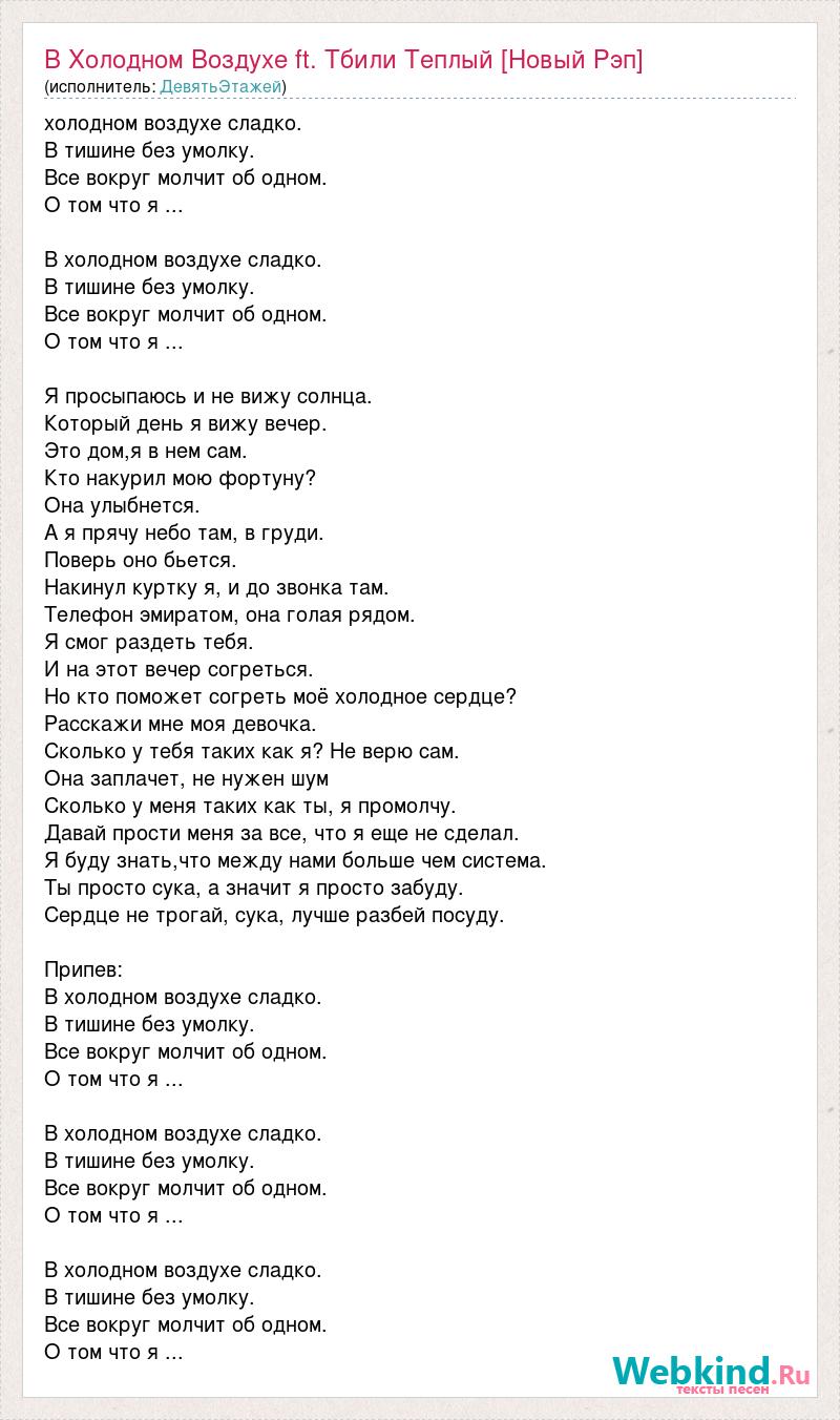 холодном воздухе сладко. В тишине без умолку. Все вокруг молчит об одном. О том что я ... В холодном воздухе сладко. В тишине без умолку. Все вокруг молчит об одном. О том что я ... Я просыпаюсь и не вижу солнца. Который день я вижу вечер. Это дом,я в нем сам. Кто накурил мою фортуну? Она улыбнется. А я прячу небо там, в груди. Поверь оно бьется. Накинул куртку я, и до звонка там. Телефон эмиратом, она голая рядом. Я смог раздеть тебя. И на этот вечер согреться. Но кто поможет согреть моё холодное сердце? Расскажи мне моя девочка. Сколько у тебя таких как я? Не верю сам. Она заплачет, не нужен шум Сколько у меня таких как ты, я промолчу. Давай прости меня за все, что я еще не сделал. Я буду знать,что между нами больше чем система. Ты просто сука, а значит я просто забуду. Сердце не трогай, сука, лучше разбей посуду. Припев: В холодном воздухе сладко. В тишине без умолку. Все вокруг молчит об одном. О том что я ... В холодном воздухе сладко. В тишине без умолку. Все вокруг молчит об одном. О том что я ... В холодном воздухе сладко. В тишине без умолку. Все вокруг молчит об одном. О том что я ...