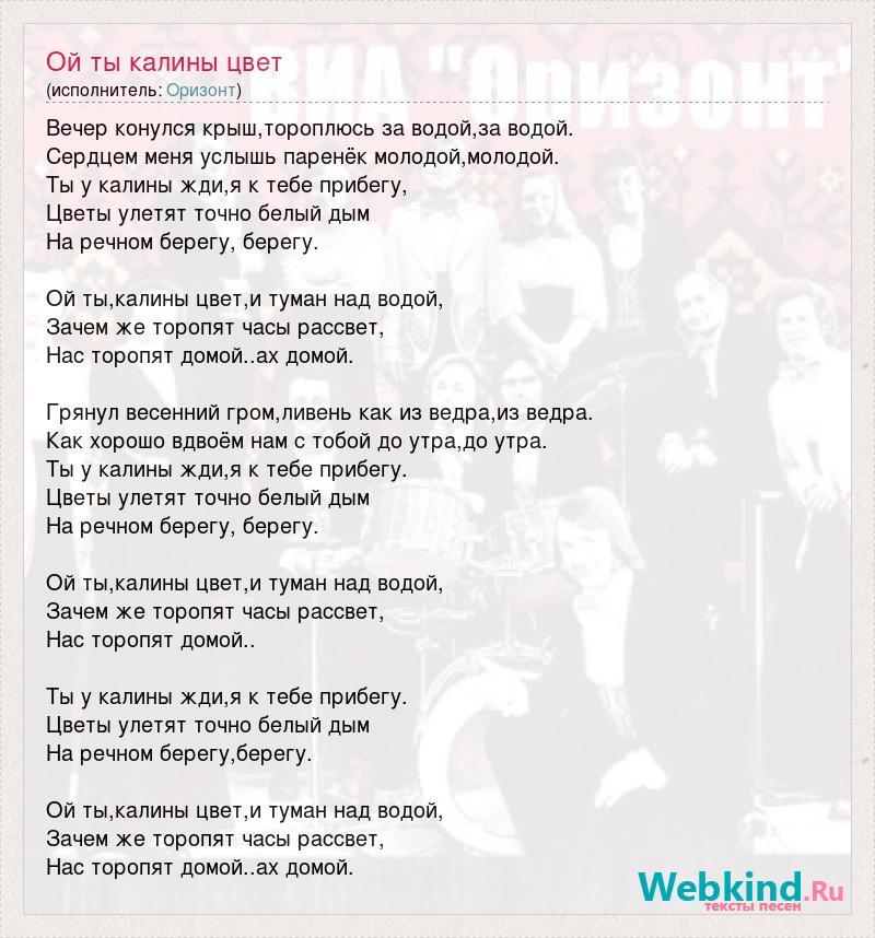 Вечер конулся крыш,тороплюсь за водой,за водой. Сердцем меня услышь паренёк молодой,молодой. Ты у калины жди,я к тебе прибегу, Цветы улетят точно белый дым На речном берегу, берегу. Ой ты,калины цвет,и туман над водой, Зачем же торопят часы рассвет, Нас торопят домой..ах домой. Грянул весенний гром,ливень как из ведра,из ведра. Как хорошо вдвоём нам с тобой до утра,до утра. Ты у калины жди,я к тебе прибегу. Цветы улетят точно белый дым На речном берегу, берегу. Ой ты,калины цвет,и туман над водой, Зачем же торопят часы рассвет, Нас торопят домой.. Ты у калины жди,я к тебе прибегу. Цветы улетят точно белый дым На речном берегу,берегу. Ой ты,калины цвет,и туман над водой, Зачем же торопят часы рассвет, Нас торопят домой..ах домой.