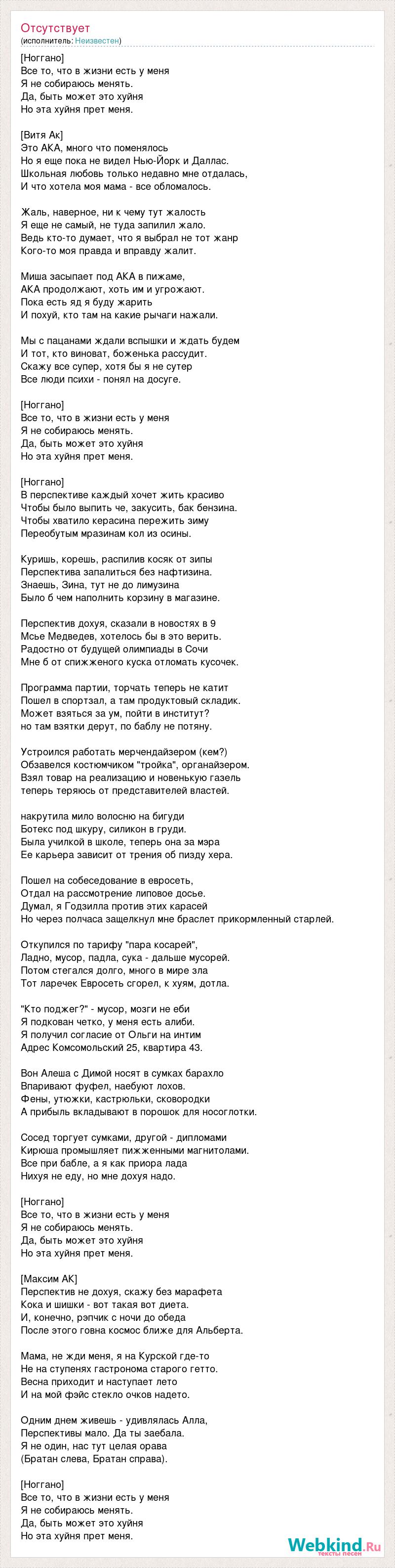 [Ноггано] Все то, что в жизни есть у меня Я не собираюсь менять. Да, быть может это хуйня Но эта хуйня прет меня. [Витя Ак] Это АКА, много что поменялось Но я еще пока не видел Нью-Йорк и Даллас. Школьная любовь только недавно мне отдалась, И что хотела моя мама - все обломалось. Жаль, наверное, ни к чему тут жалость Я еще не самый, не туда запилил жало. Ведь кто-то думает, что я выбрал не тот жанр Кого-то моя правда и вправду жалит. Миша засыпает под АКА в пижаме, АКА продолжают, хоть им и угрожают. Пока есть яд я буду жарить И похуй, кто там на какие рычаги нажали. Мы с пацанами ждали вспышки и ждать будем И тот, кто виноват, боженька рассудит. Скажу все супер, хотя бы я не сутер Все люди психи - понял на досуге. [Ноггано] Все то, что в жизни есть у меня Я не собираюсь менять. Да, быть может это хуйня Но эта хуйня прет меня. [Ноггано] В перспективе каждый хочет жить красиво Чтобы было выпить че, закусить, бак бензина. Чтобы хватило керасина пережить зиму Переобутым мразинам кол из осины. Куришь, корешь, распилив косяк от зипы Перспектива запалиться без нафтизина. Знаешь, Зина, тут не до лимузина Было б чем наполнить корзину в магазине. Перспектив дохуя, сказали в новостях в 9 Мсье Медведев, хотелось бы в это верить. Радостно от будущей олимпиады в Сочи Мне б от спижженого куска отломать кусочек. Программа партии, торчать теперь не катит Пошел в спортзал, а там продуктовый складик. Может взяться за ум, пойти в институт? но там взятки дерут, по баблу не потяну. Устроился работать мерчендайзером (кем?) Обзавелся костюмчиком "тройка", органайзером. Взял товар на реализацию и новенькую газель теперь теряюсь от представителей властей. накрутила мило волосню на бигуди Ботекс под шкуру, силикон в груди. Была училкой в школе, теперь она за мэра Ее карьера зависит от трения об пизду хера. Пошел на собеседование в евросеть, Отдал на рассмотрение липовое досье. Думал, я Годзилла против этих карасей Но через полчаса защелкнул мне браслет прикормленный старлей. Откупился по тарифу "пара косарей", Ладно, мусор, падла, сука - дальше мусорей. Потом стегался долго, много в мире зла Тот ларечек Евросеть сгорел, к хуям, дотла. "Кто поджег?" - мусор, мозги не еби Я подкован четко, у меня есть алиби. Я получил согласие от Ольги на интим Адрес Комсомольский 25, квартира 43. Вон Алеша с Димой носят в сумках барахло Впаривают фуфел, наебуют лохов. Фены, утюжки, кастрюльки, сковородки А прибыль вкладывают в порошок для носоглотки. Сосед торгует сумками, другой - дипломами Кирюша промышляет пижженными магнитолами. Все при бабле, а я как приора лада Нихуя не еду, но мне дохуя надо. [Ноггано] Все то, что в жизни есть у меня Я не собираюсь менять. Да, быть может это хуйня Но эта хуйня прет меня. [Максим АК] Перспектив не дохуя, скажу без марафета Кока и шишки - вот такая вот диета. И, конечно, рэпчик с ночи до обеда После этого говна космос ближе для Альберта. Мама, не жди меня, я на Курской где-то Не на ступенях гастронома старого гетто. Весна приходит и наступает лето И на мой фэйс стекло очков надето. Одним днем живешь - удивлялась Алла, Перспективы мало. Да ты заебала. Я не один, нас тут целая орава (Братан слева, Братан справа). [Ноггано] Все то, что в жизни есть у меня Я не собираюсь менять. Да, быть может это хуйня Но эта хуйня прет меня.
