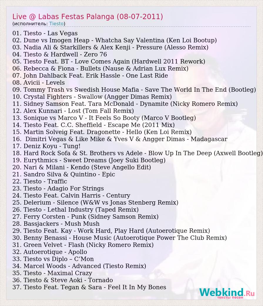 01. Tiesto - Las Vegas 02. Dune vs Imogen Heap - Whatcha Say Valentina (Ken Loi Bootup) 03. Nadia Ali & Starkillers & Alex Kenji - Pressure (Alesso Remix) 04. Tiesto & Hardwell - Zero 76 05. Tiesto Feat. BT - Love Comes Again (Hardwell 2011 Rework) 06. Rebecca & Fiona - Bullets (Nause & Adrian Lux Remix) 07. John Dahlback Feat. Erik Hassle - One Last Ride 08. Avicii - Levels 09. Tommy Trash vs Swedish House Mafia - Save The World In The End (Bootleg) 10. Crystal Fighters - Swallow (Angger Dimas Remix) 11. Sidney Samson Feat. Tara McDonald - Dynamite (Nicky Romero Remix) 12. Alex Kunnari - Lost (Tom Fall Remix) 13. Sonique vs Marco V - It Feels So Booty (Marco V Bootleg) 14. Tiesto Feat. C.C. Sheffield - Escape Me (2011 Mix) 15. Martin Solveig Feat. Dragonette - Hello (Ken Loi Remix) 16. Dimitri Vegas & Like Mike & Yves V & Angger Dimas - Madagascar 17. Deniz Koyu - Tung! 18. Hard Rock Sofa & St. Brothers vs Adele - Blow Up In The Deep (Axwell Bootleg) 19. Eurythmics - Sweet Dreams (Joey Suki Bootleg) 20. Nari & Milani - Kendo (Steve Angello Edit) 21. Sandro Silva & Quintino - Epic 22. Tiesto - Traffic 23. Tiesto - Adagio For Strings 24. Tiesto Feat. Calvin Harris - Century 25. Delerium - Silence (W&W vs Jonas Stenberg Remix) 26. Tiesto - Lethal Industry (Taped Remix) 27. Ferry Corsten - Punk (Sidney Samson Remix) 28. Bassjackers - Mush Mush 29. Tiesto Feat. Kay - Work Hard, Play Hard (Autoerotique Remix) 30. Benny Benassi - House Music (Autoerotique Power The Club Remix) 31. Green Velvet - Flash (Nicky Romero Remix) 32. Autoerotique - Apollo 33. Tiesto vs Diplo – C’Mon 34. Marcel Woods - Advanced (Tiesto Remix) 35. Tiesto - Maximal Crazy 36. Tiesto & Steve Aoki - Tornado 37. Tiesto Feat. Tegan & Sara - Feel It In My Bones
