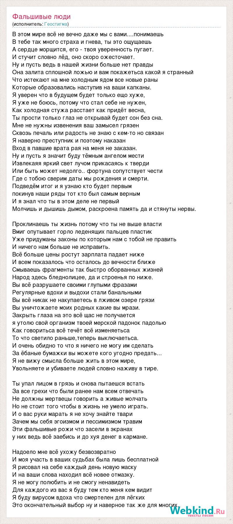 В этом мире всё не вечно даже мы с вами....понимаешь В тебе так много страха и гнева, ты это ощущаешь А сердце морщится, его - твоя уверенность пугает. И стучит словно лёд, оно скоро ожесточает. Ну и пусть ведь в нашей жизни больше нет правды Она залита сплошной ложью и вам покажетьса какой я странный Что истекают на мне холодным ядом все новые раны Которые образовались наступив на ваши капканы. Я уверен что в будущем будет только ещо хуже, Я уже не боюсь, потому что стал себе не нужен, Как холодная стужа расстает как придёт весна, Ты прости только глаз не открывай будет сон без сна. Мне не нужны извенения ваш замысел грязен Сквозь печаль или радость не знаю с кем-то но связан Я наверно преступник и поэтому наказан Вход в павшие врата рая на меня не заказан. Ну и пусть я значит буду тёмным ангелом мести Извлекаяя яркий свет лучом прикасаясь к тверди Или быть может недолго.. фортуна сопутствует чести Где с тобою сверим даты мы рождения и смерти. Подведём итог и я узнаю кто будет первым покинув наши ряды тот кто был самым верным И я знал что ты в этом деле не первый Молчишь и дышишь дымом, раскроена память да и стянуты нервы. Проклинаешь ты жизнь потому что ты не выше власти Вмиг опутывает горло леденящих пальцев пластик Уже придуманы законы по которым нам с тобой не править И ничего нам больше не исправить. Всё больше цены ростут зарплата падает ниже И всем показалось что осталось до вечности ближе Смываешь фрагменты так быстро оборванных жизней Народ здесь бледнолицее, да и строенья по ниже. Вы всё разрушаете своими глупыми фразами Регулярные вдохи и выдохи стали банальными Вы всё никак не накупаетесь в лживом озере грязи Вы уничтожаете моих родных какие вы мрази. Закрыть глаза на это всё щас не получается я утолю свой организм твоей мерской падонок падолью Как говоритьса всё течёт всё изменяетьса То что светило раньше,теперь выключаетьса. И очень обидно то что я ничего не могу им сделать За ёбаные бумажки вы можете кого угодно предать... Я не вижу смысла больше жить в этом мире, Увольняете и убиваете людей словно наживу в тире. Ты упал лицом в грязь и снова пытаешся встать За все грехи что были ранее нам всем отвечать Не должны мертвецы говорить а живые молчать Но не стоит того чтобы в жизнь не умело играть. И о вас руки марать я не хочу знайте твари Зачем мы себя эгоизмом и пессимизмом травим Эти фальшивые рожи что засели в экранах у них ведь всё заебись и до хуя денег в кармане. Надоело мне всё ухожу безвозвратно И моя участь в ваших судьбах была лишь бесплатной Я рисовал на себе каждый день новую маску И на ваши слова находил всё новее отмазку. Я не могу полюбить и не смогу ненавидеть Для каждого из вас я буду тем кто меня кем видит Я буду вирусом вдоха что смертелен для лёгких Это окончательный выбор ну и наверное так же для многих.