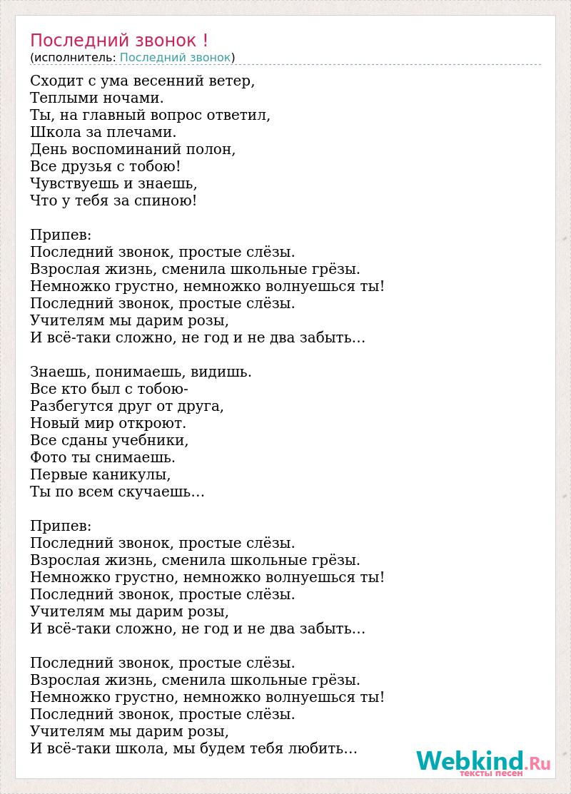Сходит с ума весенний ветер, Теплыми ночами. Ты, на главный вопрос ответил, Школа за плечами. День воспоминаний полон, Все друзья с тобою! Чувствуешь и знаешь, Что у тебя за спиною! Припев: Последний звонок, простые слёзы. Взрослая жизнь, сменила школьные грёзы. Немножко грустно, немножко волнуешься ты! Последний звонок, простые слёзы. Учителям мы дарим розы, И всё-таки сложно, не год и не два забыть… Знаешь, понимаешь, видишь. Все кто был с тобою- Разбегутся друг от друга, Новый мир откроют. Все сданы учебники, Фото ты снимаешь. Первые каникулы, Ты по всем скучаешь… Припев: Последний звонок, простые слёзы. Взрослая жизнь, сменила школьные грёзы. Немножко грустно, немножко волнуешься ты! Последний звонок, простые слёзы. Учителям мы дарим розы, И всё-таки сложно, не год и не два забыть… Последний звонок, простые слёзы. Взрослая жизнь, сменила школьные грёзы. Немножко грустно, немножко волнуешься ты! Последний звонок, простые слёзы. Учителям мы дарим розы, И всё-таки школа, мы будем тебя любить…