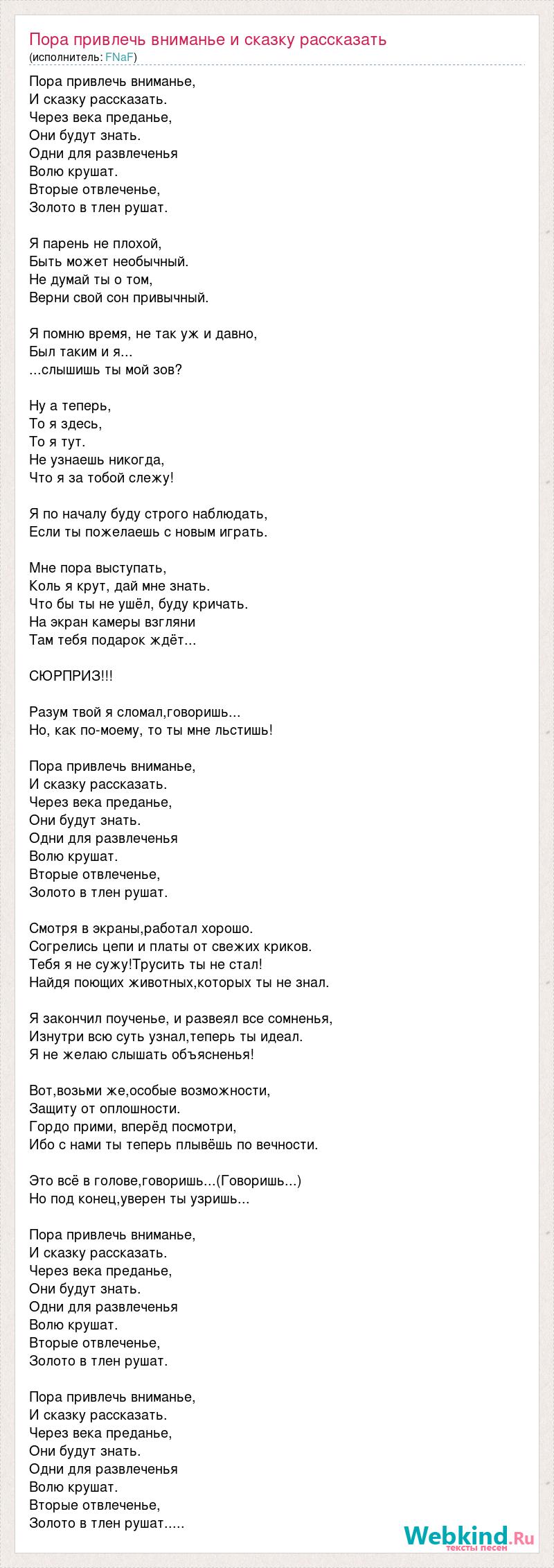 Пора привлечь вниманье, И сказку рассказать. Через века преданье, Они будут знать. Одни для развлеченья Волю крушат. Вторые отвлеченье, Золото в тлен рушат. Я парень не плохой, Быть может необычный. Не думай ты о том, Верни свой сон привычный. Я помню время, не так уж и давно, Был таким и я... ...слышишь ты мой зов? Ну а теперь, То я здесь, То я тут. Не узнаешь никогда, Что я за тобой слежу! Я по началу буду строго наблюдать, Если ты пожелаешь с новым играть. Мне пора выступать, Коль я крут, дай мне знать. Что бы ты не ушёл, буду кричать. На экран камеры взгляни Там тебя подарок ждёт... СЮРПРИЗ!!! Разум твой я сломал,говоришь... Но, как по-моему, то ты мне льстишь! Пора привлечь вниманье, И сказку рассказать. Через века преданье, Они будут знать. Одни для развлеченья Волю крушат. Вторые отвлеченье, Золото в тлен рушат. Смотря в экраны,работал хорошо. Согрелись цепи и платы от свежих криков. Тебя я не сужу!Трусить ты не стал! Найдя поющих животных,которых ты не знал. Я закончил поученье, и развеял все сомненья, Изнутри всю суть узнал,теперь ты идеал. Я не желаю слышать объясненья! Вот,возьми же,особые возможности, Защиту от оплошности. Гордо прими, вперёд посмотри, Ибо с нами ты теперь плывёшь по вечности. Это всё в голове,говоришь...(Говоришь...) Но под конец,уверен ты узришь... Пора привлечь вниманье, И сказку рассказать. Через века преданье, Они будут знать. Одни для развлеченья Волю крушат. Вторые отвлеченье, Золото в тлен рушат. Пора привлечь вниманье, И сказку рассказать. Через века преданье, Они будут знать. Одни для развлеченья Волю крушат. Вторые отвлеченье, Золото в тлен рушат.....