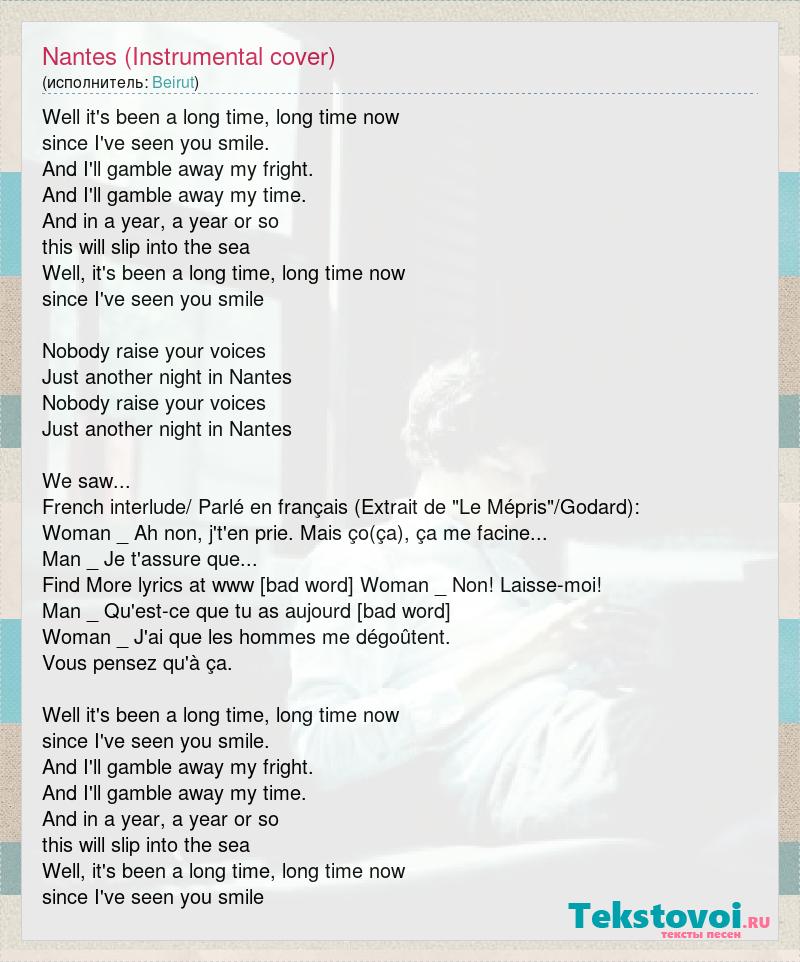 Well it's been a long time, long time now since I've seen you smile. And I'll gamble away my fright. And I'll gamble away my time. And in a year, a year or so this will slip into the sea Well, it's been a long time, long time now since I've seen you smile Nobody raise your voices Just another night in Nantes Nobody raise your voices Just another night in Nantes We saw... French interlude/ Parlé en français (Extrait de "Le Mépris"/Godard): Woman _ Ah non, j't'en prie. Mais ço(ça), ça me facine... Man _ Je t'assure que... Find More lyrics at www [bad word] Woman _ Non! Laisse-moi! Man _ Qu'est-ce que tu as aujourd [bad word] Woman _ J'ai que les hommes me dégoûtent. Vous pensez qu'à ça. Well it's been a long time, long time now since I've seen you smile. And I'll gamble away my fright. And I'll gamble away my time. And in a year, a year or so this will slip into the sea Well, it's been a long time, long time now since I've seen you smile