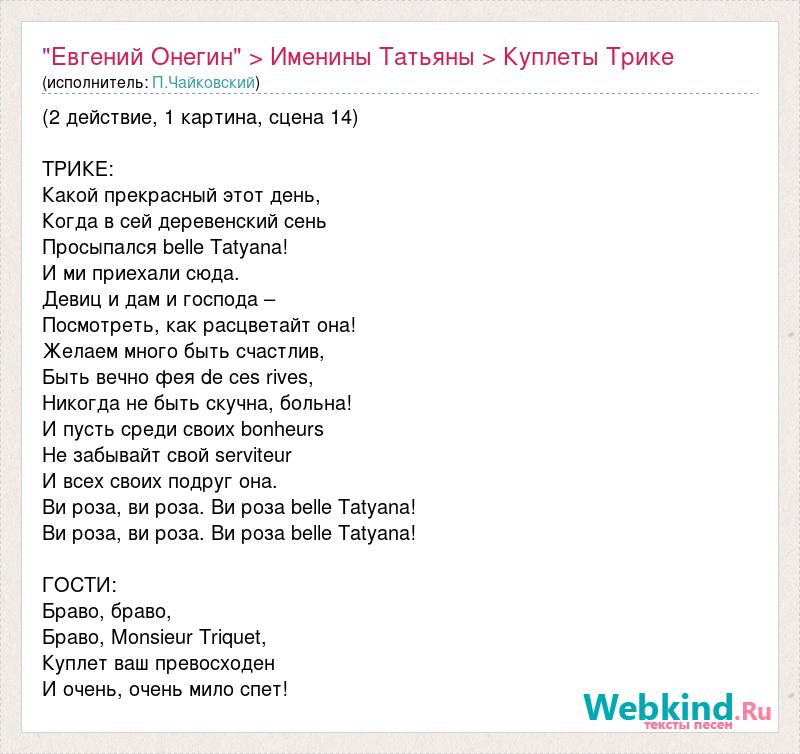 (2 действие, 1 картина, сцена 14) ТРИКЕ: Какой прекрасный этот день, Когда в сей деревенский сень Просыпался belle Tatyana! И ми приехали сюда. Девиц и дам и господа – Посмотреть, как расцветайт она! Желаем много быть счастлив, Быть вечно фея de ces rives, Никогда не быть скучна, больна! И пусть среди своих bonheurs Не забывайт свой serviteur И всех своих подруг она. Ви роза, ви роза. Ви роза belle Tatyana! Ви роза, ви роза. Ви роза belle Tatyana! ГОСТИ: Браво, браво, Браво, Monsieur Triquet, Куплет ваш превосходен И очень, очень мило спет!