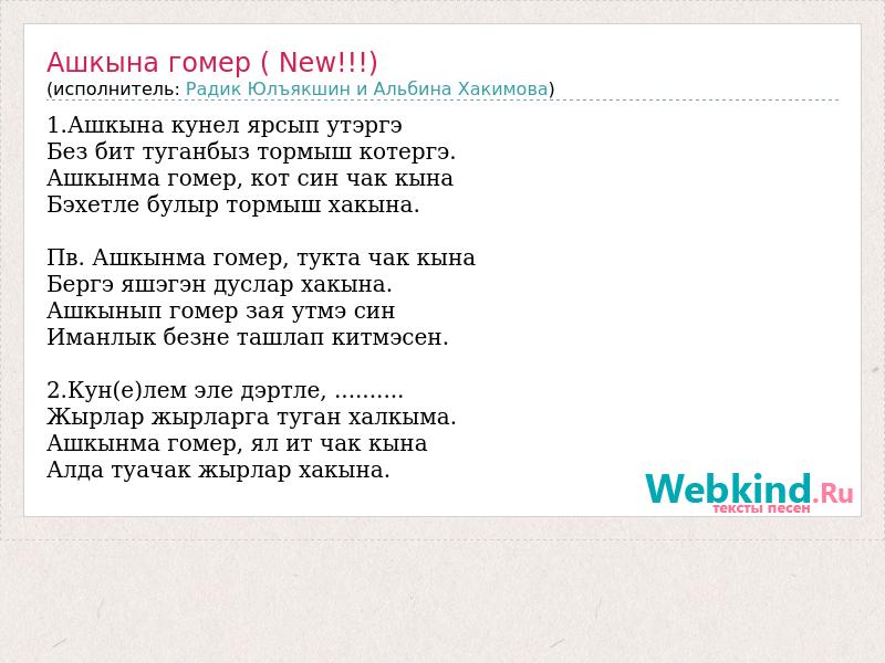 1.Ашкына кунел ярсып утэргэ Без бит туганбыз тормыш котергэ. Ашкынма гомер, кот син чак кына Бэхетле булыр тормыш хакына. Пв. Ашкынма гомер, тукта чак кына Бергэ яшэгэн дуслар хакына. Ашкынып гомер зая утмэ син Иманлык безне ташлап китмэсен. 2.Кун(е)лем эле дэртле, .......... Жырлар жырларга туган халкыма. Ашкынма гомер, ял ит чак кына Алда туачак жырлар хакына.