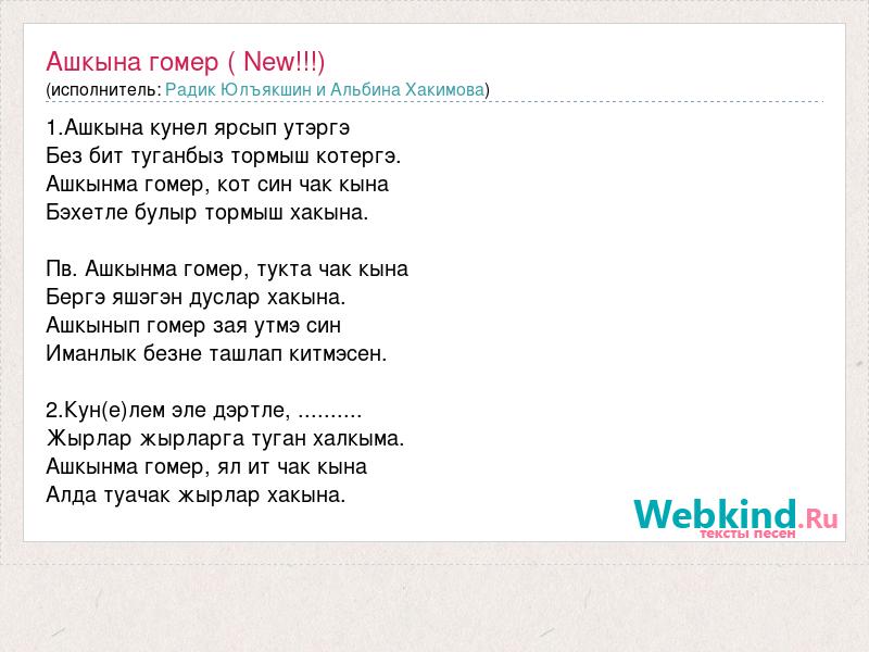 1.Ашкына кунел ярсып утэргэ Без бит туганбыз тормыш котергэ. Ашкынма гомер, кот син чак кына Бэхетле булыр тормыш хакына. Пв. Ашкынма гомер, тукта чак кына Бергэ яшэгэн дуслар хакына. Ашкынып гомер зая утмэ син Иманлык безне ташлап китмэсен. 2.Кун(е)лем эле дэртле, .......... Жырлар жырларга туган халкыма. Ашкынма гомер, ял ит чак кына Алда туачак жырлар хакына.