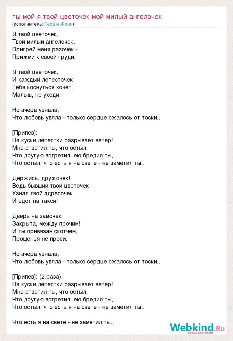 Я твой цветочек, Твой милый ангелочек. Пригрей меня разочек - Прижми к своей груди. Я твой цветочек, И каждый лепесточек Тебя коснуться хочет. Малыш, не уходи. Но вчера узнала, Что любовь увяла - только сердце сжалось от тоски.. [Припев]: На куски лепестки разрывает ветер! Мне ответил ты, что остыл, Что другую встретил, ею бредил ты, Что остыл, что есть я на свете - не заметил ты.. Держись, дружочек! Ведь бывший твой цветочек Узнал твой адресочек И едет на такси! Дверь на замочек Закрыта, между прочим! И ты привязан скотчем, Прощенья не проси. Но вчера узнала, Что любовь увяла - только сердце сжалось от тоски.. [Припев]: (2 раза) На куски лепестки разрывает ветер! Мне ответил ты, что остыл, Что другую встретил, ею бредил ты, Что остыл, что есть я на свете - не заметил ты.. Что есть я на свете - не заметил ты..