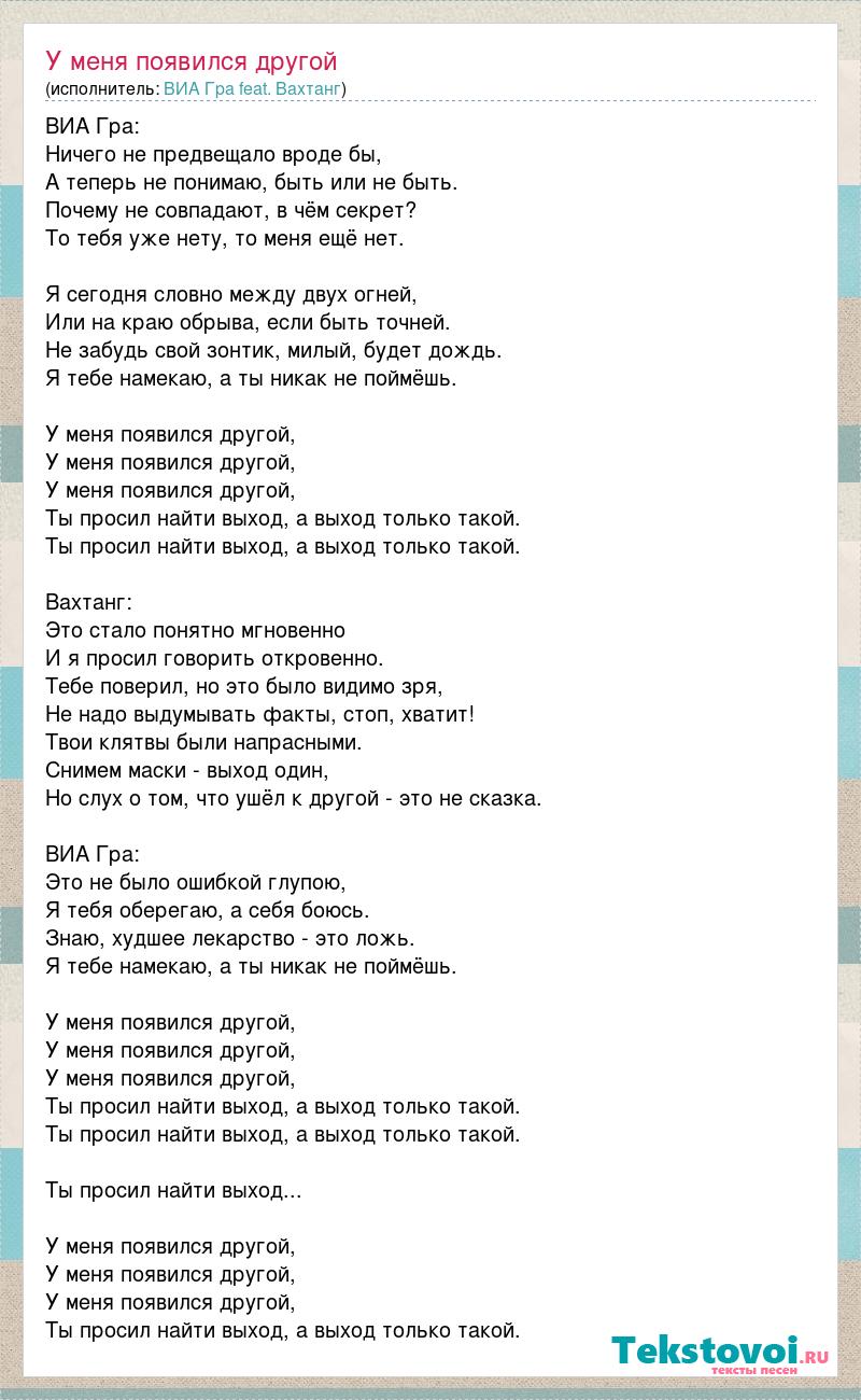 ВИА Гра: Ничего не предвещало вроде бы, А теперь не понимаю, быть или не быть. Почему не совпадают, в чём секрет? То тебя уже нету, то меня ещё нет. Я сегодня словно между двух огней, Или на краю обрыва, если быть точней. Не забудь свой зонтик, милый, будет дождь. Я тебе намекаю, а ты никак не поймёшь. У меня появился другой, У меня появился другой, У меня появился другой, Ты просил найти выход, а выход только такой. Ты просил найти выход, а выход только такой. Вахтанг: Это стало понятно мгновенно И я просил говорить откровенно. Тебе поверил, но это было видимо зря, Не надо выдумывать факты, стоп, хватит! Твои клятвы были напрасными. Снимем маски - выход один, Но слух о том, что ушёл к другой - это не сказка. ВИА Гра: Это не было ошибкой глупою, Я тебя оберегаю, а себя боюсь. Знаю, худшее лекарство - это ложь. Я тебе намекаю, а ты никак не поймёшь. У меня появился другой, У меня появился другой, У меня появился другой, Ты просил найти выход, а выход только такой. Ты просил найти выход, а выход только такой. Ты просил найти выход... У меня появился другой, У меня появился другой, У меня появился другой, Ты просил найти выход, а выход только такой.