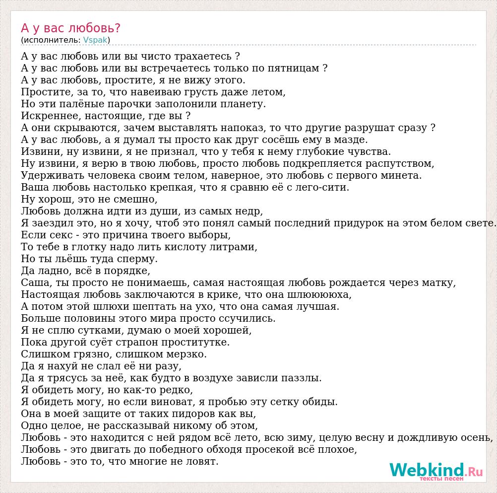 А у вас любовь или вы чисто трахаетесь ? А у вас любовь или вы встречаетесь только по пятницам ? А у вас любовь, простите, я не вижу этого. Простите, за то, что навеиваю грусть даже летом, Но эти палёные парочки заполонили планету. Искреннее, настоящие, где вы ? А они скрываются, зачем выставлять напоказ, то что другие разрушат сразу ? А у вас любовь, а я думал ты просто как друг сосёшь ему в мазде. Извини, ну извини, я не признал, что у тебя к нему глубокие чувства. Ну извини, я верю в твою любовь, просто любовь подкрепляется распутством, Удерживать человека своим телом, наверное, это любовь с первого минета. Ваша любовь настолько крепкая, что я сравню её с лего-сити. Ну хорош, это не смешно, Любовь должна идти из души, из самых недр, Я заездил это, но я хочу, чтоб это понял самый последний придурок на этом белом свете. Если секс - это причина твоего выборы, То тебе в глотку надо лить кислоту литрами, Но ты льёшь туда сперму. Да ладно, всё в порядке, Саша, ты просто не понимаешь, самая настоящая любовь рождается через матку, Настоящая любовь заключаются в крике, что она шлююююха, А потом этой шлюхи шептать на ухо, что она самая лучшая. Больше половины этого мира просто ссучились. Я не сплю сутками, думаю о моей хорошей, Пока другой суёт страпон проститутке. Слишком грязно, слишком мерзко. Да я нахуй не слал её ни разу, Да я трясусь за неё, как будто в воздухе зависли паззлы. Я обидеть могу, но как-то редко, Я обидеть могу, но если виноват, я пробью эту сетку обиды. Она в моей защите от таких пидоров как вы, Одно целое, не рассказывай никому об этом, Любовь - это находится с ней рядом всё лето, всю зиму, целую весну и дождливую осень, Любовь - это двигать до победного обходя просекой всё плохое, Любовь - это то, что многие не ловят.