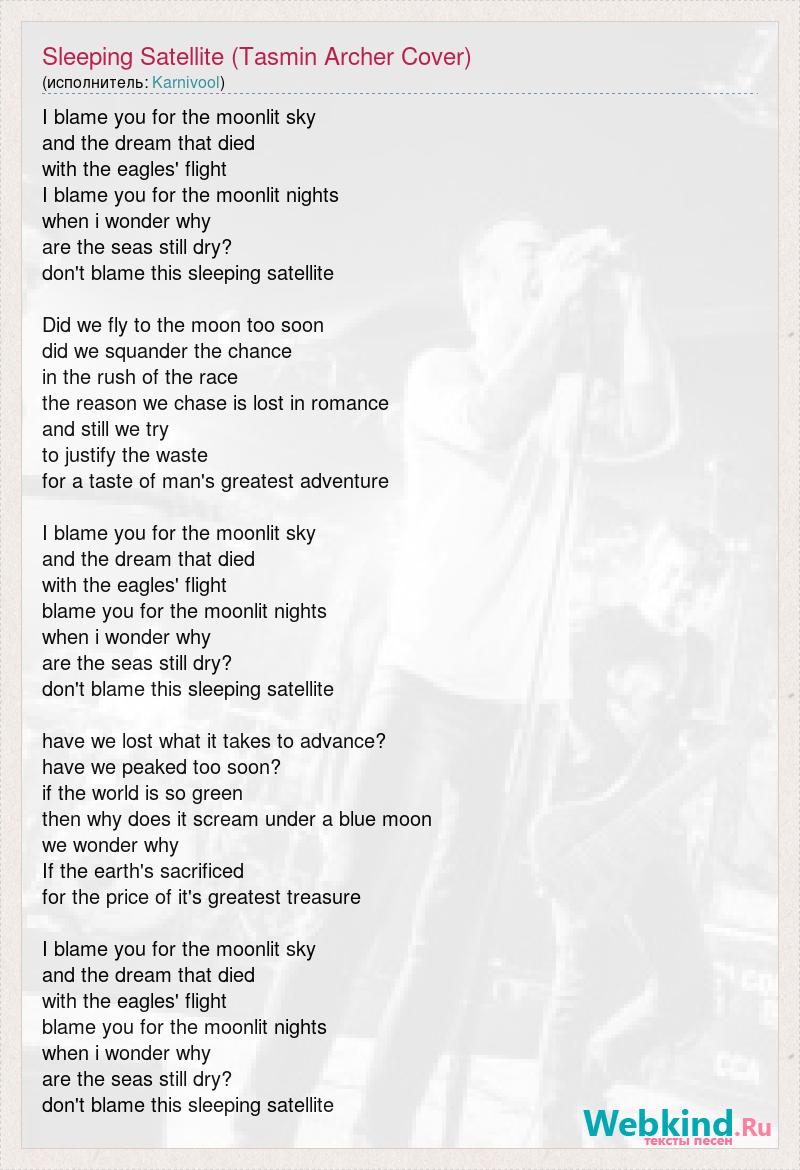 I blame you for the moonlit sky and the dream that died with the eagles' flight I blame you for the moonlit nights when i wonder why are the seas still dry? don't blame this sleeping satellite Did we fly to the moon too soon did we squander the chance in the rush of the race the reason we chase is lost in romance and still we try to justify the waste for a taste of man's greatest adventure I blame you for the moonlit sky and the dream that died with the eagles' flight blame you for the moonlit nights when i wonder why are the seas still dry? don't blame this sleeping satellite have we lost what it takes to advance? have we peaked too soon? if the world is so green then why does it scream under a blue moon we wonder why If the earth's sacrificed for the price of it's greatest treasure I blame you for the moonlit sky and the dream that died with the eagles' flight blame you for the moonlit nights when i wonder why are the seas still dry? don't blame this sleeping satellite
