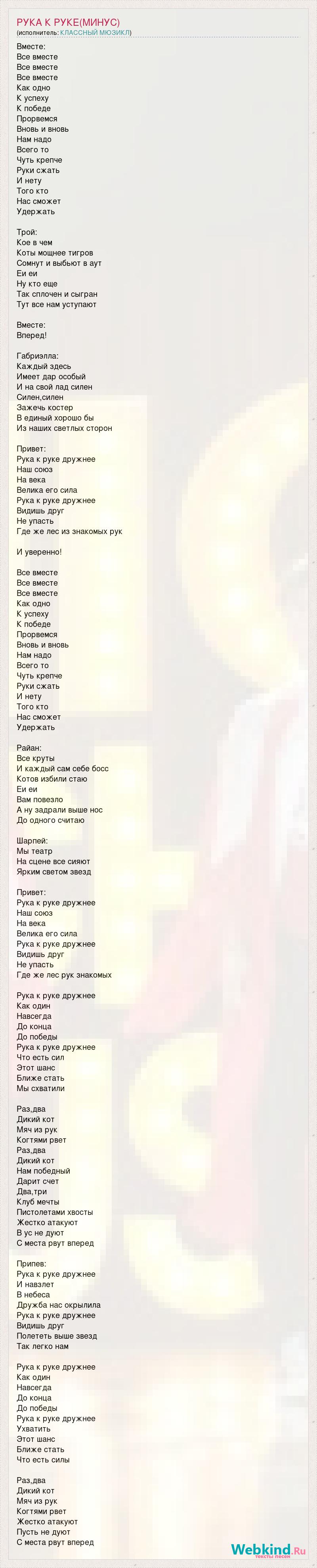 Вместе: Все вместе Все вместе Все вместе Как одно К успеху К победе Прорвемся Вновь и вновь Нам надо Всего то Чуть крепче Руки сжать И нету Того кто Нас сможет Удержать Трой: Кое в чем Коты мощнее тигров Сомнут и выбьют в аут Еи еи Ну кто еще Так сплочен и сыгран Тут все нам уступают Вместе: Вперед! Габриэлла: Каждый здесь Имеет дар особый И на свой лад силен Силен,силен Зажечь костер В единый хорошо бы Из наших светлых сторон Привет: Рука к руке дружнее Наш союз На века Велика его сила Рука к руке дружнее Видишь друг Не упасть Где же лес из знакомых рук И уверенно! Все вместе Все вместе Все вместе Как одно К успеху К победе Прорвемся Вновь и вновь Нам надо Всего то Чуть крепче Руки сжать И нету Того кто Нас сможет Удержать Райан: Все круты И каждый сам себе босс Котов избили стаю Еи еи Вам повезло А ну задрали выше нос До одного считаю Шарпей: Мы театр На сцене все сияют Ярким светом звезд Привет: Рука к руке дружнее Наш союз На века Велика его сила Рука к руке дружнее Видишь друг Не упасть Где же лес рук знакомых Рука к руке дружнее Как один Навсегда До конца До победы Рука к руке дружнее Что есть сил Этот шанс Ближе стать Мы схватили Раз,два Дикий кот Мяч из рук Когтями рвет Раз,два Дикий кот Нам победный Дарит счет Два,три Клуб мечты Пистолетами хвосты Жестко атакуют В ус не дуют С места рвут вперед Припев: Рука к руке дружнее И навзлет В небеса Дружба нас окрылила Рука к руке дружнее Видишь друг Полететь выше звезд Так легко нам Рука к руке дружнее Как один Навсегда До конца До победы Рука к руке дружнее Ухватить Этот шанс Ближе стать Что есть силы Раз,два Дикий кот Мяч из рук Когтями рвет Жестко атакуют Пусть не дуют С места рвут вперед