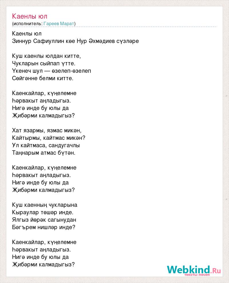 Каенлы юл Зиннур Сафиуллин көе Нур Әхмәдиев сүзләре Куш каенлы юлдан китте, Чукларын сыйпап үтте. Үкенеч шул — өзелеп-өзелеп Сөйгәнне белми китте. Каенкайлар, күңелемне Һәрвакыт аңладыгыз. Нигә инде бу юлы да Җибәрми калмадыгыз? Хат язармы, язмас микән, Кайтырмы, кайтмас микән? Ул кайтмаса, сандугачлы Таңнарым атмас бүтән. Каенкайлар, күңелемне Һәрвакыт аңладыгыз. Нигә инде бу юлы да Җибәрми калмадыгыз? Куш каенның чукларына Кыраулар төшәр инде. Ялгыз йөрәк сагынудан Бәгърем нишләр инде? Каенкайлар, күңелемне Һәрвакыт аңладыгыз. Нигә инде бу юлы да Җибәрми калмадыгыз?