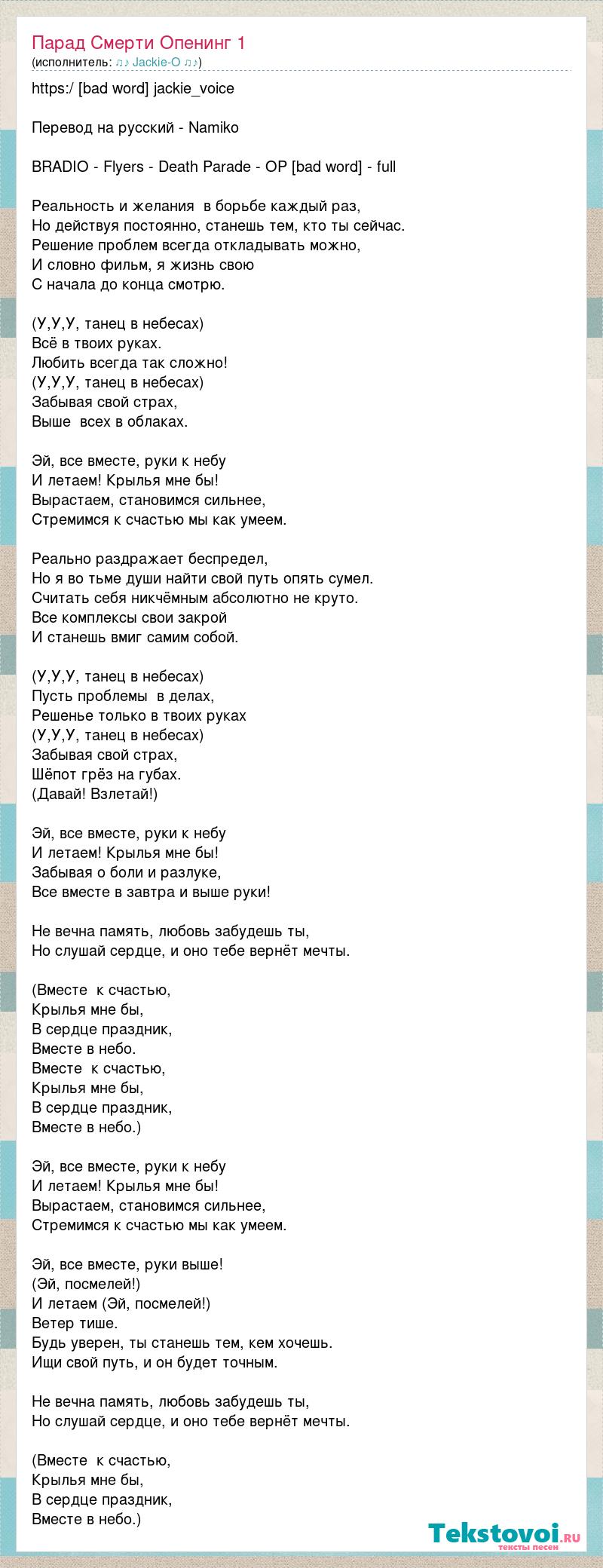 https:/ [bad word] jackie_voice Перевод на русский - Namiko BRADIO - Flyers - Death Parade - OP - rus - full Реальность и желания в борьбе каждый раз, Но действуя постоянно, станешь тем, кто ты сейчас. Решение проблем всегда откладывать можно, И словно фильм, я жизнь свою С начала до конца смотрю. (У,У,У, танец в небесах) Всё в твоих руках. Любить всегда так сложно! (У,У,У, танец в небесах) Забывая свой страх, Выше всех в облаках. Эй, все вместе, руки к небу И летаем! Крылья мне бы! Вырастаем, становимся сильнее, Стремимся к счастью мы как умеем. Реально раздражает беспредел, Но я во тьме души найти свой путь опять сумел. Считать себя никчёмным абсолютно не круто. Все комплексы свои закрой И станешь вмиг самим собой. (У,У,У, танец в небесах) Пусть проблемы в делах, Решенье только в твоих руках (У,У,У, танец в небесах) Забывая свой страх, Шёпот грёз на губах. (Давай! Взлетай!) Эй, все вместе, руки к небу И летаем! Крылья мне бы! Забывая о боли и разлуке, Все вместе в завтра и выше руки! Не вечна память, любовь забудешь ты, Но слушай сердце, и оно тебе вернёт мечты. (Вместе к счастью, Крылья мне бы, В сердце праздник, Вместе в небо. Вместе к счастью, Крылья мне бы, В сердце праздник, Вместе в небо.) Эй, все вместе, руки к небу И летаем! Крылья мне бы! Вырастаем, становимся сильнее, Стремимся к счастью мы как умеем. Эй, все вместе, руки выше! (Эй, посмелей!) И летаем (Эй, посмелей!) Ветер тише. Будь уверен, ты станешь тем, кем хочешь. Ищи свой путь, и он будет точным. Не вечна память, любовь забудешь ты, Но слушай сердце, и оно тебе вернёт мечты. (Вместе к счастью, Крылья мне бы, В сердце праздник, Вместе в небо.)