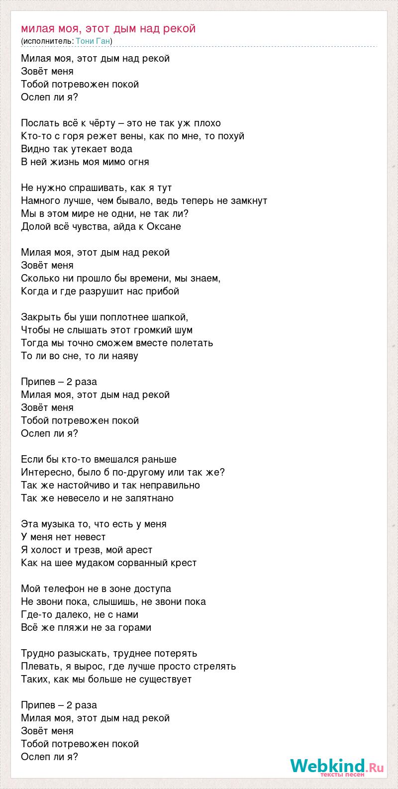 Милая моя, этот дым над рекой Зовёт меня Тобой потревожен покой Ослеп ли я? Послать всё к чёрту – это не так уж плохо Кто-то с горя режет вены, как по мне, то похуй Видно так утекает вода В ней жизнь моя мимо огня Не нужно спрашивать, как я тут Намного лучше, чем бывало, ведь теперь не замкнут Мы в этом мире не одни, не так ли? Долой всё чувства, айда к Оксане Милая моя, этот дым над рекой Зовёт меня Сколько ни прошло бы времени, мы знаем, Когда и где разрушит нас прибой Закрыть бы уши поплотнее шапкой, Чтобы не слышать этот громкий шум Тогда мы точно сможем вместе полетать То ли во сне, то ли наяву Припев – 2 раза Милая моя, этот дым над рекой Зовёт меня Тобой потревожен покой Ослеп ли я? Если бы кто-то вмешался раньше Интересно, было б по-другому или так же? Так же настойчиво и так неправильно Так же невесело и не запятнано Эта музыка то, что есть у меня У меня нет невест Я холост и трезв, мой арест Как на шее мудаком сорванный крест Мой телефон не в зоне доступа Не звони пока, слышишь, не звони пока Где-то далеко, не с нами Всё же пляжи не за горами Трудно разыскать, труднее потерять Плевать, я вырос, где лучше просто стрелять Таких, как мы больше не существует Припев – 2 раза Милая моя, этот дым над рекой Зовёт меня Тобой потревожен покой Ослеп ли я?