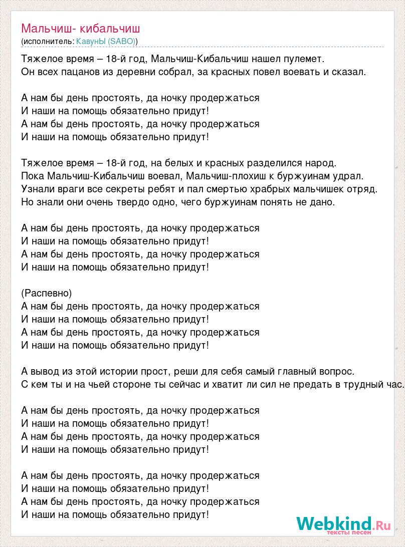 Тяжелое время – 18-й год, Мальчиш-Кибальчиш нашел пулемет. Он всех пацанов из деревни собрал, за красных повел воевать и сказал. А нам бы день простоять, да ночку продержаться И наши на помощь обязательно придут! А нам бы день простоять, да ночку продержаться И наши на помощь обязательно придут! Тяжелое время – 18-й год, на белых и красных разделился народ. Пока Мальчиш-Кибальчиш воевал, Мальчиш-плохиш к буржуинам удрал. Узнали враги все секреты ребят и пал смертью храбрых мальчишек отряд. Но знали они очень твердо одно, чего буржуинам понять не дано. А нам бы день простоять, да ночку продержаться И наши на помощь обязательно придут! А нам бы день простоять, да ночку продержаться И наши на помощь обязательно придут! (Распевно) А нам бы день простоять, да ночку продержаться И наши на помощь обязательно придут! А нам бы день простоять, да ночку продержаться И наши на помощь обязательно придут! А вывод из этой истории прост, реши для себя самый главный вопрос. С кем ты и на чьей стороне ты сейчас и хватит ли сил не предать в трудный час. А нам бы день простоять, да ночку продержаться И наши на помощь обязательно придут! А нам бы день простоять, да ночку продержаться И наши на помощь обязательно придут! А нам бы день простоять, да ночку продержаться И наши на помощь обязательно придут! А нам бы день простоять, да ночку продержаться И наши на помощь обязательно придут!