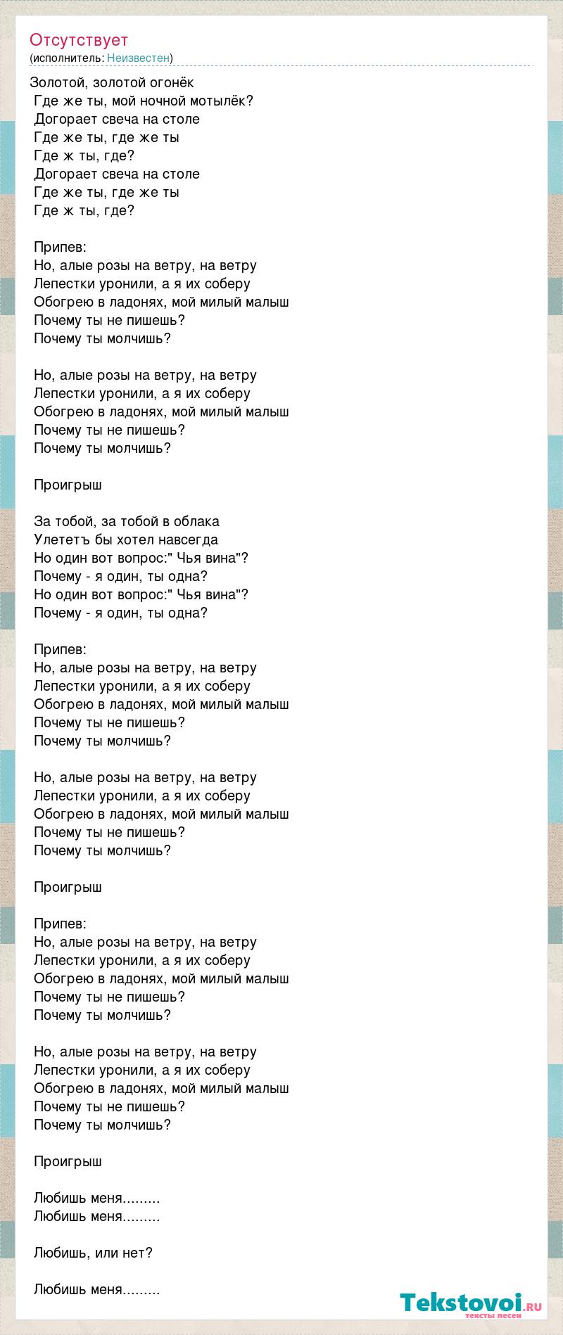 Золотой, золотой огонёк Где же ты, мой ночной мотылёк? Догорает свеча на столе Где же ты, где же ты Где ж ты, где? Догорает свеча на столе Где же ты, где же ты Где ж ты, где? Припев: Но, алые розы на ветру, на ветру Лепестки уронили, а я их соберу Обогрею в ладонях, мой милый малыш Почему ты не пишешь? Почему ты молчишь? Но, алые розы на ветру, на ветру Лепестки уронили, а я их соберу Обогрею в ладонях, мой милый малыш Почему ты не пишешь? Почему ты молчишь? Проигрыш За тобой, за тобой в облака Улететъ бы хотел навсегда Но один вот вопрос:" Чья вина"? Почему - я один, ты одна? Но один вот вопрос:" Чья вина"? Почему - я один, ты одна? Припев: Но, алые розы на ветру, на ветру Лепестки уронили, а я их соберу Обогрею в ладонях, мой милый малыш Почему ты не пишешь? Почему ты молчишь? Но, алые розы на ветру, на ветру Лепестки уронили, а я их соберу Обогрею в ладонях, мой милый малыш Почему ты не пишешь? Почему ты молчишь? Проигрыш Припев: Но, алые розы на ветру, на ветру Лепестки уронили, а я их соберу Обогрею в ладонях, мой милый малыш Почему ты не пишешь? Почему ты молчишь? Но, алые розы на ветру, на ветру Лепестки уронили, а я их соберу Обогрею в ладонях, мой милый малыш Почему ты не пишешь? Почему ты молчишь? Проигрыш Любишь меня......... Любишь меня......... Любишь, или нет? Любишь меня.........