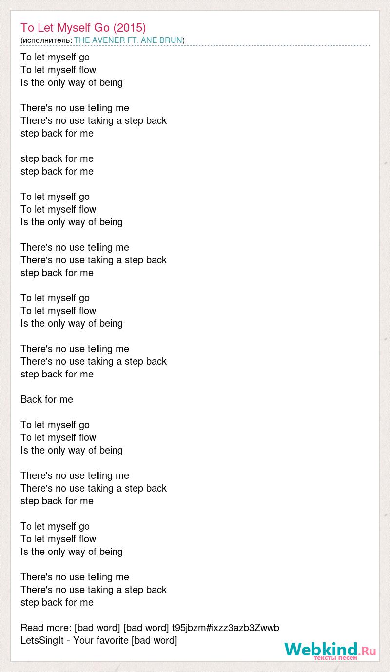 To let myself go To let myself flow Is the only way of being There's no use telling me There's no use taking a step back step back for me step back for me step back for me To let myself go To let myself flow Is the only way of being There's no use telling me There's no use taking a step back step back for me To let myself go To let myself flow Is the only way of being There's no use telling me There's no use taking a step back step back for me Back for me To let myself go To let myself flow Is the only way of being There's no use telling me There's no use taking a step back step back for me To let myself go To let myself flow Is the only way of being There's no use telling me There's no use taking a step back step back for me Read more: [bad word] [bad word] t95jbzm#ixzz3azb3Zwwb LetsSingIt - Your favorite [bad word]