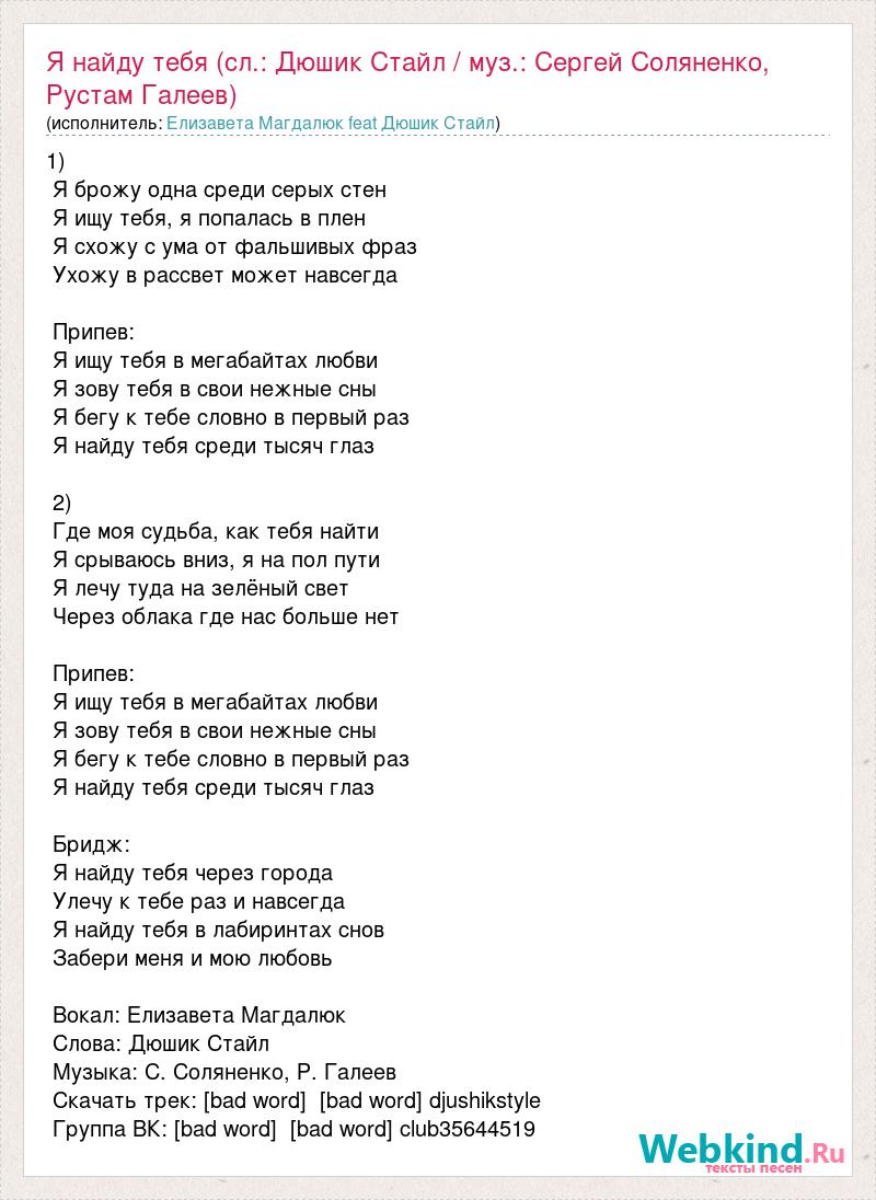 1) Я брожу одна среди серых стен Я ищу тебя, я попалась в плен Я схожу с ума от фальшивых фраз Ухожу в рассвет может навсегда Припев: Я ищу тебя в мегабайтах любви Я зову тебя в свои нежные сны Я бегу к тебе словно в первый раз Я найду тебя среди тысяч глаз 2) Где моя судьба, как тебя найти Я срываюсь вниз, я на пол пути Я лечу туда на зелёный свет Через облака где нас больше нет Припев: Я ищу тебя в мегабайтах любви Я зову тебя в свои нежные сны Я бегу к тебе словно в первый раз Я найду тебя среди тысяч глаз Бридж: Я найду тебя через города Улечу к тебе раз и навсегда Я найду тебя в лабиринтах снов Забери меня и мою любовь Вокал: Елизавета Магдалюк Слова: Дюшик Стайл Музыка: С. Соляненко, Р. Галеев Скачать трек: [bad word] [bad word] djushikstyle Группа ВК: [bad word] [bad word] club35644519