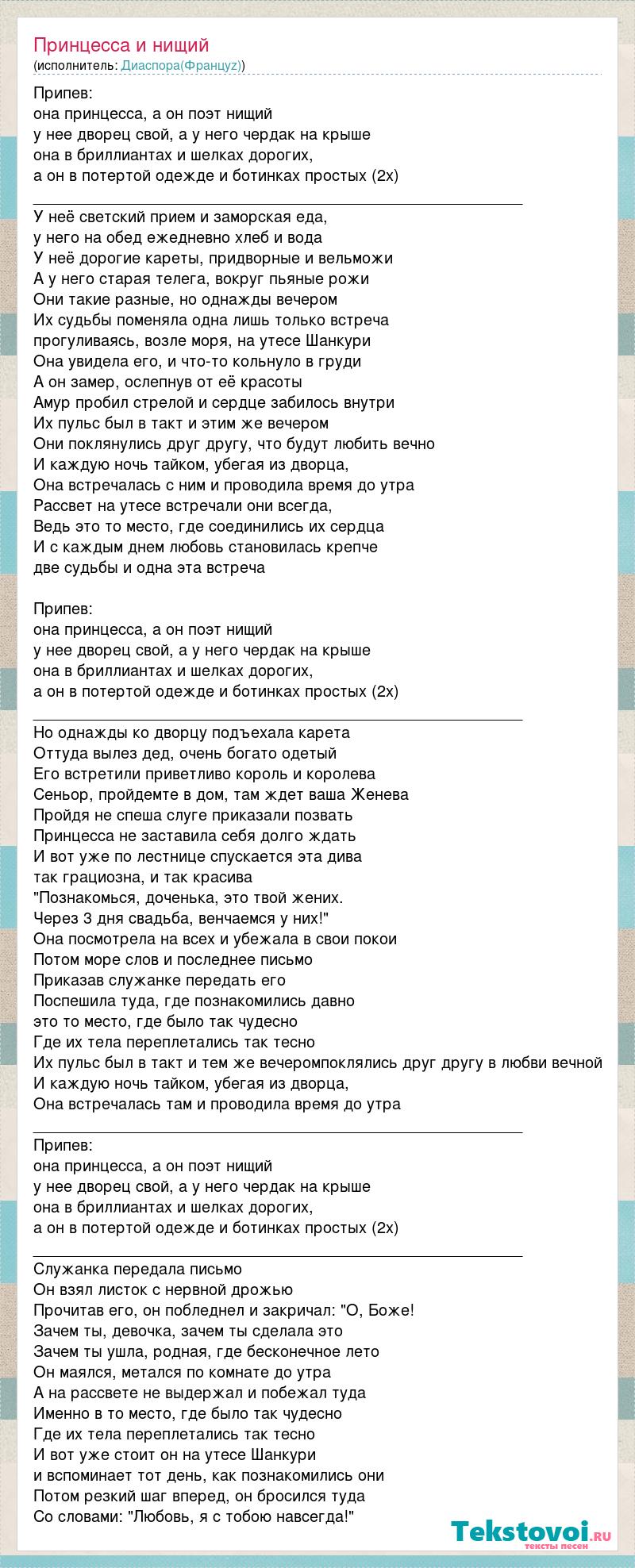 Припев: она принцесса, а он поэт нищий у нее дворец свой, а у него чердак на крыше она в бриллиантах и шелках дорогих, а он в потертой одежде и ботинках простых (2х) ________________________________________________________ У неё светский прием и заморская еда, у него на обед ежедневно хлеб и вода У неё дорогие кареты, придворные и вельможи А у него старая телега, вокруг пьяные рожи Они такие разные, но однажды вечером Их судьбы поменяла одна лишь только встреча прогуливаясь, возле моря, на утесе Шанкури Она увидела его, и что-то кольнуло в груди А он замер, ослепнув от её красоты Амур пробил стрелой и сердце забилось внутри Их пульс был в такт и этим же вечером Они поклянулись друг другу, что будут любить вечно И каждую ночь тайком, убегая из дворца, Она встречалась с ним и проводила время до утра Рассвет на утесе встречали они всегда, Ведь это то место, где соединились их сердца И с каждым днем любовь становилась крепче две судьбы и одна эта встреча Припев: она принцесса, а он поэт нищий у нее дворец свой, а у него чердак на крыше она в бриллиантах и шелках дорогих, а он в потертой одежде и ботинках простых (2х) ________________________________________________________ Но однажды ко дворцу подъехала карета Оттуда вылез дед, очень богато одетый Его встретили приветливо король и королева Сеньор, пройдемте в дом, там ждет ваша Женева Пройдя не спеша слуге приказали позвать Принцесса не заставила себя долго ждать И вот уже по лестнице спускается эта дива так грациозна, и так красива "Познакомься, доченька, это твой жених. Через 3 дня свадьба, венчаемся у них!" Она посмотрела на всех и убежала в свои покои Потом море слов и последнее письмо Приказав служанке передать его Поспешила туда, где познакомились давно это то место, где было так чудесно Где их тела переплетались так тесно Их пульс был в такт и тем же вечеромпоклялись друг другу в любви вечной И каждую ночь тайком, убегая из дворца, Она встречалась там и проводила время до утра ________________________________________________________ Припев: она принцесса, а он поэт нищий у нее дворец свой, а у него чердак на крыше она в бриллиантах и шелках дорогих, а он в потертой одежде и ботинках простых (2х) ________________________________________________________ Служанка передала письмо Он взял листок с нервной дрожью Прочитав его, он побледнел и закричал: "О, Боже! Зачем ты, девочка, зачем ты сделала это Зачем ты ушла, родная, где бесконечное лето Он маялся, метался по комнате до утра А на рассвете не выдержал и побежал туда Именно в то место, где было так чудесно Где их тела переплетались так тесно И вот уже стоит он на утесе Шанкури и вспоминает тот день, как познакомились они Потом резкий шаг вперед, он бросился туда Со словами: "Любовь, я с тобою навсегда!"