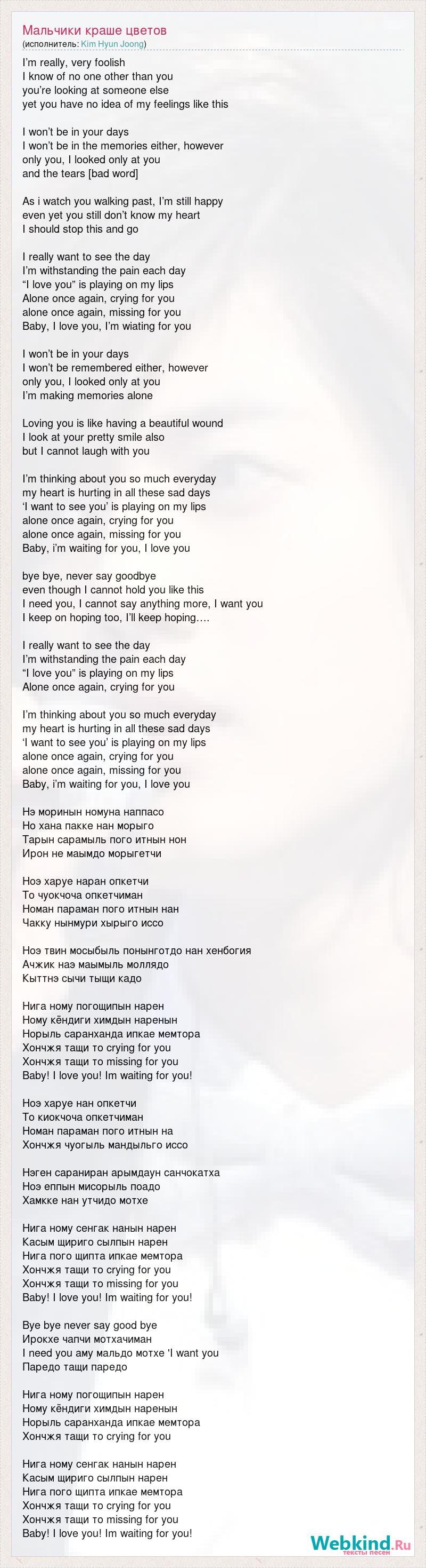I’m really, very foolish I know of no one other than you you’re looking at someone else yet you have no idea of my feelings like this I won’t be in your days I won’t be in the memories either, however only you, I looked only at you and the tears [bad word] As i watch you walking past, I’m still happy even yet you still don’t know my heart I should stop this and go I really want to see the day I’m withstanding the pain each day “I love you” is playing on my lips Alone once again, crying for you alone once again, missing for you Baby, I love you, I’m wiating for you I won’t be in your days I won’t be remembered either, however only you, I looked only at you I’m making memories alone Loving you is like having a beautiful wound I look at your pretty smile also but I cannot laugh with you I’m thinking about you so much everyday my heart is hurting in all these sad days ‘I want to see you’ is playing on my lips alone once again, crying for you alone once again, missing for you Baby, i’m waiting for you, I love you bye bye, never say goodbye even though I cannot hold you like this I need you, I cannot say anything more, I want you I keep on hoping too, I’ll keep hoping…. I really want to see the day I’m withstanding the pain each day “I love you” is playing on my lips Alone once again, crying for you I’m thinking about you so much everyday my heart is hurting in all these sad days ‘I want to see you’ is playing on my lips alone once again, crying for you alone once again, missing for you Baby, i’m waiting for you, I love you Нэ моринын номуна наппасо Но хана пакке нан морыго Тарын сарамыль пого итнын нон Ирон не маымдо морыгетчи Ноэ харуе наран опкетчи То чуокчоча опкетчиман Номан параман пого итнын нан Чакку нынмури хырыго иссо Ноэ твин мосыбыль понынготдо нан хенбогия Ачжик наэ маымыль моллядо Кыттнэ сычи тыщи кадо Нига ному погощипын нарен Ному кёндиги химдын наренын Норыль саранханда ипкае мемтора Хончжя тащи то crying for you Хончжя тащи то missing for you Baby! I love you! Im waiting for you! Ноэ харуе нан опкетчи То киокчоча опкетчиман Номан параман пого итнын на Хончжя чуогыль мандыльго иссо Нэген сараниран арымдаун санчокатха Ноэ еппын мисорыль поадо Хамкке нан утчидо мотхе Нига ному сенгак нанын нарен Касым щириго сылпын нарен Нига пого щипта ипкае мемтора Хончжя тащи то crying for you Хончжя тащи то missing for you Baby! I love you! Im waiting for you! Bye bye never say good bye Ирокхе чапчи мотхачиман I need you аму мальдо мотхе 'I want you Паредо тащи паредо Нига ному погощипын нарен Ному кёндиги химдын наренын Норыль саранханда ипкае мемтора Хончжя тащи то crying for you Нига ному сенгак нанын нарен Касым щириго сылпын нарен Нига пого щипта ипкае мемтора Хончжя тащи то crying for you Хончжя тащи то missing for you Baby! I love you! Im waiting for you!