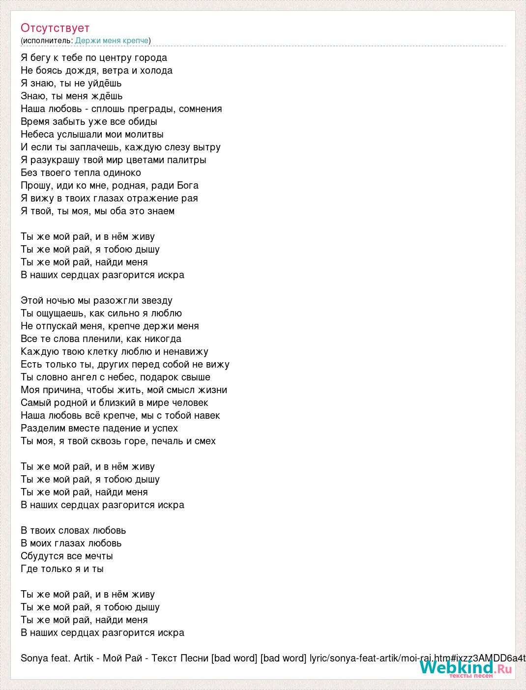 Я бегу к тебе по центру города Не боясь дождя, ветра и холода Я знаю, ты не уйдёшь Знаю, ты меня ждёшь Наша любовь - сплошь преграды, сомнения Время забыть уже все обиды Небеса услышали мои молитвы И если ты заплачешь, каждую слезу вытру Я разукрашу твой мир цветами палитры Без твоего тепла одиноко Прошу, иди ко мне, родная, ради Бога Я вижу в твоих глазах отражение рая Я твой, ты моя, мы оба это знаем Ты же мой рай, и в нём живу Ты же мой рай, я тобою дышу Ты же мой рай, найди меня В наших сердцах разгорится искра Этой ночью мы разожгли звезду Ты ощущаешь, как сильно я люблю Не отпускай меня, крепче держи меня Все те слова пленили, как никогда Каждую твою клетку люблю и ненавижу Есть только ты, других перед собой не вижу Ты словно ангел с небес, подарок свыше Моя причина, чтобы жить, мой смысл жизни Самый родной и близкий в мире человек Наша любовь всё крепче, мы с тобой навек Разделим вместе падение и успех Ты моя, я твой сквозь горе, печаль и смех Ты же мой рай, и в нём живу Ты же мой рай, я тобою дышу Ты же мой рай, найди меня В наших сердцах разгорится искра В твоих словах любовь В моих глазах любовь Сбудутся все мечты Где только я и ты Ты же мой рай, и в нём живу Ты же мой рай, я тобою дышу Ты же мой рай, найди меня В наших сердцах разгорится искра Sonya feat. Artik - Мой Рай - Текст Песни [bad word] [bad word] lyric/sonya-feat-artik/moi-rai.htm#ixzz3AMDD6a4t