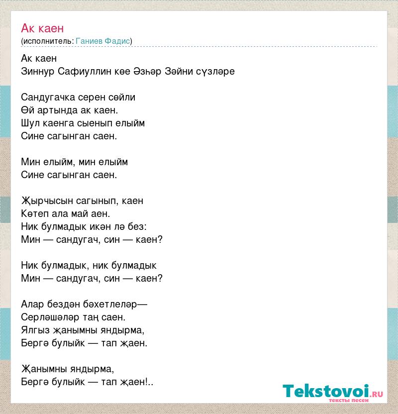 Ак каен Зиннур Сафиуллин көе Әзһәр Зәйни сүзләре Сандугачка серен сөйли Өй артында ак каен. Шул каенга сыенып елыйм Сине сагынган саен. Мин елыйм, мин елыйм Сине сагынган саен. Җырчысын сагынып, каен Көтеп ала май аен. Ник булмадык икән лә без: Мин — сандугач, син — каен? Ник булмадык, ник булмадык Мин — сандугач, син — каен? Алар бездән бәхетлеләр— Серләшәләр таң саен. Ялгыз җанымны яндырма, Бергә булыйк — тап җаен. Җанымны яндырма, Бергә булыйк — тап җаен!..