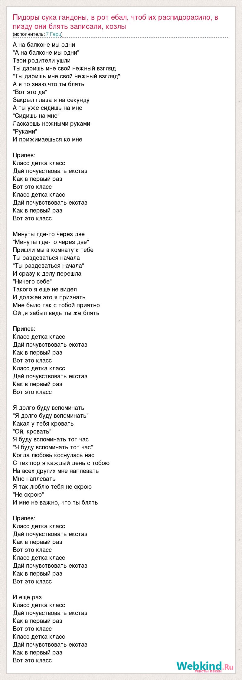 А на балконе мы одни "А на балконе мы одни" Твои родители ушли Ты даришь мне свой нежный взгляд "Ты даришь мне свой нежный взгляд" А я то знаю,что ты блять "Вот это да" Закрыл глаза я на секунду А ты уже сидишь на мне "Сидишь на мне" Ласкаешь нежными руками "Руками" И прижимаешься ко мне Припев: Класс детка класс Дай почувствовать екстаз Как в первый раз Вот это класс Класс детка класс Дай почувствовать екстаз Как в первый раз Вот это класс Минуты где-то через две "Минуты где-то через две" Пришли мы в комнату к тебе Ты раздеваться начала "Ты раздеваться начала" И сразу к делу перешла "Ничего себе" Такого я еще не видел И должен это я признать Мне было так с тобой приятно Ой ,я забыл ведь ты же блять Припев: Класс детка класс Дай почувствовать екстаз Как в первый раз Вот это класс Класс детка класс Дай почувствовать екстаз Как в первый раз Вот это класс Я долго буду вспоминать "Я долго буду вспоминать" Какая у тебя кровать "Ой, кровать" Я буду вспоминать тот час "Я буду вспоминать тот час" Когда любовь коснулась нас С тех пор я каждый день с тобою На всех других мне наплевать Мне наплевать Я так люблю тебя не скрою "Не скрою" И мне не важно, что ты блять Припев: Класс детка класс Дай почувствовать екстаз Как в первый раз Вот это класс Класс детка класс Дай почувствовать екстаз Как в первый раз Вот это класс И еще раз Класс детка класс Дай почувствовать екстаз Как в первый раз Вот это класс Класс детка класс Дай почувствовать екстаз Как в первый раз Вот это класс