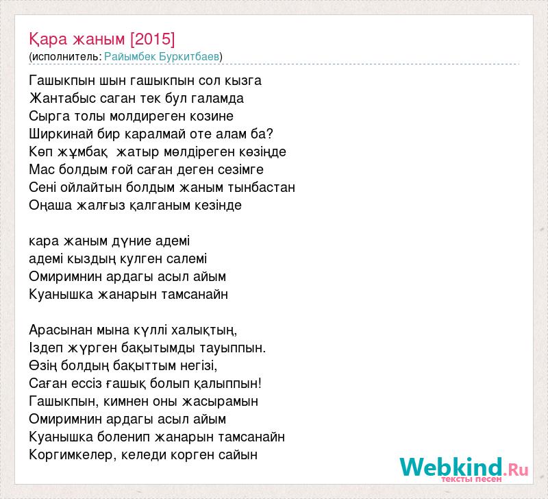 Гашыкпын шын гашыкпын сол кызга Жантабыc саган тек бул галамда Сырга толы молдиреген козине Ширкинай бир каралмай оте алам ба? Көп жұмбақ жатыр мөлдіреген көзіңде Мас болдым ғой саған деген сезімге Сені ойлайтын болдым жаным тынбастан Оңаша жалғыз қалганым кезінде кара жаным дүние адемі адемі кыздың кулген салемі Омиримнин ардагы асыл айым Куанышка жанарын тамсанайн Арасынан мына күллі халықтың, Іздеп жүрген бақытымды тауыппын. Өзің болдың бақыттым негізі, Саған ессіз ғашық болып қалыппын! Гашыкпын, кимнен оны жасырамын Омиримнин ардагы асыл айым Куанышка боленип жанарын тамсанайн Коргимкелер, келеди корген сайын