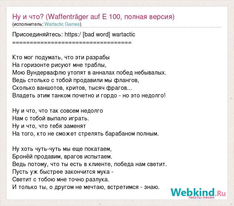 Присоединяйтесь: https:/ [bad word] wartactic ================================== Кто мог подумать, что эти разрабы На горизонте рисуют мне траблы, Мою Вундервафлю утопят в анналах побед небывалых. Ведь столько с тобой продавили мы флангов, Сколько ваншотов, критов, тысяч фрагов... Владеть этим танком почетно и гордо - но это недолго! Ну и что, что так совсем недолго Нам с тобой выпало играть. Ну и что, что тебя заменят На того, кто не сможет стрелять барабаном полным. Ну хоть чуть-чуть мы еще покатаем, Бронёй продавим, врагов испытаем. Ведь потому, что ты есть в клиенте, победа нам светит. Пусть уж быстрее закончится мука - Светит с тобою мне точно разлука. И только ты, о другом не мечтаю, встретимся - знаю.