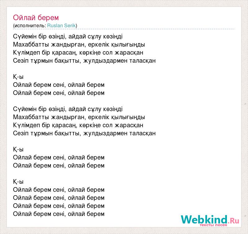Сүйемін бір өзіңді, айдай сұлу көзіңді Махаббатты жандырған, еркелік қылығыңды Күлімдеп бір қарасаң, көркіңе сол жарасқан Сезіп тұрмын бақытты, жулдыздармен таласқан Қ-ы Ойлай берем сені, ойлай берем Ойлай берем сені, ойлай берем Сүйемін бір өзіңді, айдай сұлу көзіңді Махаббатты жандырған, еркелік қылығыңды Күлімдеп бір қарасаң, көркіңе сол жарасқан Сезіп тұрмын бақытты, жулдыздармен таласқан Қ-ы Ойлай берем сені, ойлай берем Ойлай берем сені, ойлай берем Қ-ы Ойлай берем сені, ойлай берем Ойлай берем сені, ойлай берем Ойлай берем сені, ойлай берем Ойлай берем сені, ойлай берем