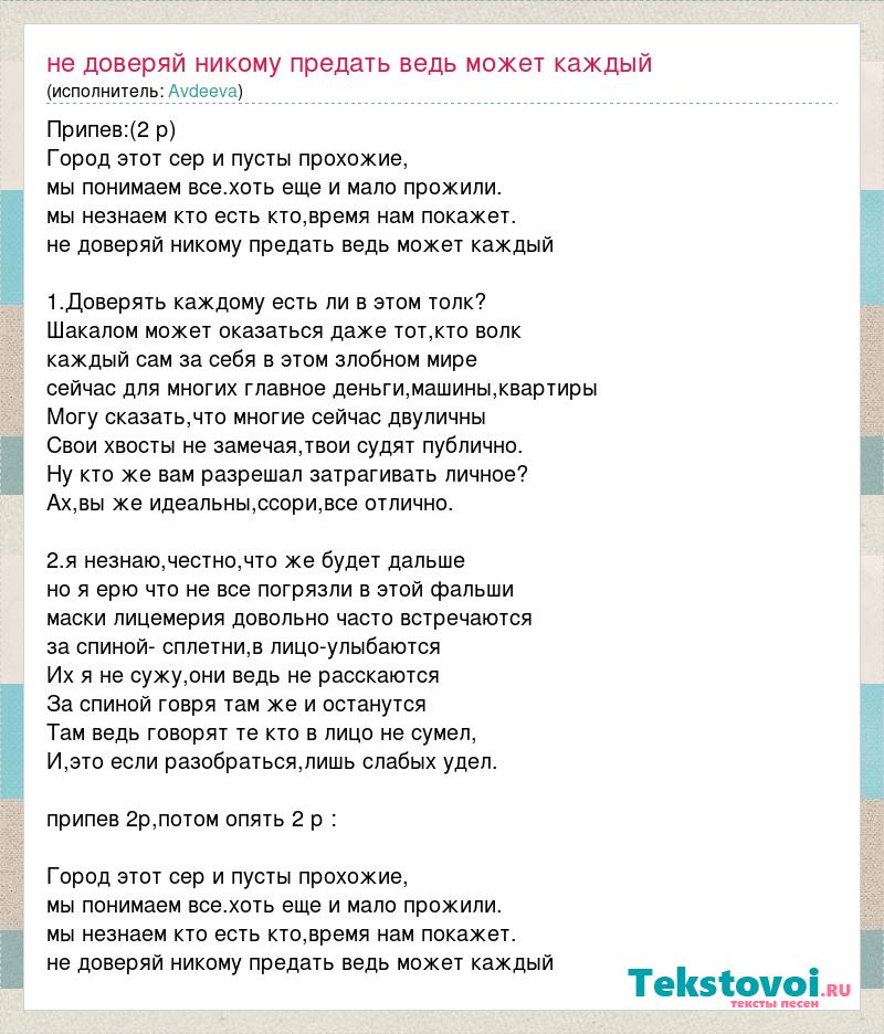 Припев:(2 р) Город этот сер и пусты прохожие, мы понимаем все.хоть еще и мало прожили. мы незнаем кто есть кто,время нам покажет. не доверяй никому предать ведь может каждый 1.Доверять каждому есть ли в этом толк? Шакалом может оказаться даже тот,кто волк каждый сам за себя в этом злобном мире сейчас для многих главное деньги,машины,квартиры Могу сказать,что многие сейчас двуличны Свои хвосты не замечая,твои судят публично. Ну кто же вам разрешал затрагивать личное? Ах,вы же идеальны,ссори,все отлично. 2.я незнаю,честно,что же будет дальше но я ерю что не все погрязли в этой фальши маски лицемерия довольно часто встречаются за спиной- сплетни,в лицо-улыбаются Их я не сужу,они ведь не расскаются За спиной говря там же и останутся Там ведь говорят те кто в лицо не сумел, И,это если разобраться,лишь слабых удел. припев 2р,потом опять 2 р : Город этот сер и пусты прохожие, мы понимаем все.хоть еще и мало прожили. мы незнаем кто есть кто,время нам покажет. не доверяй никому предать ведь может каждый