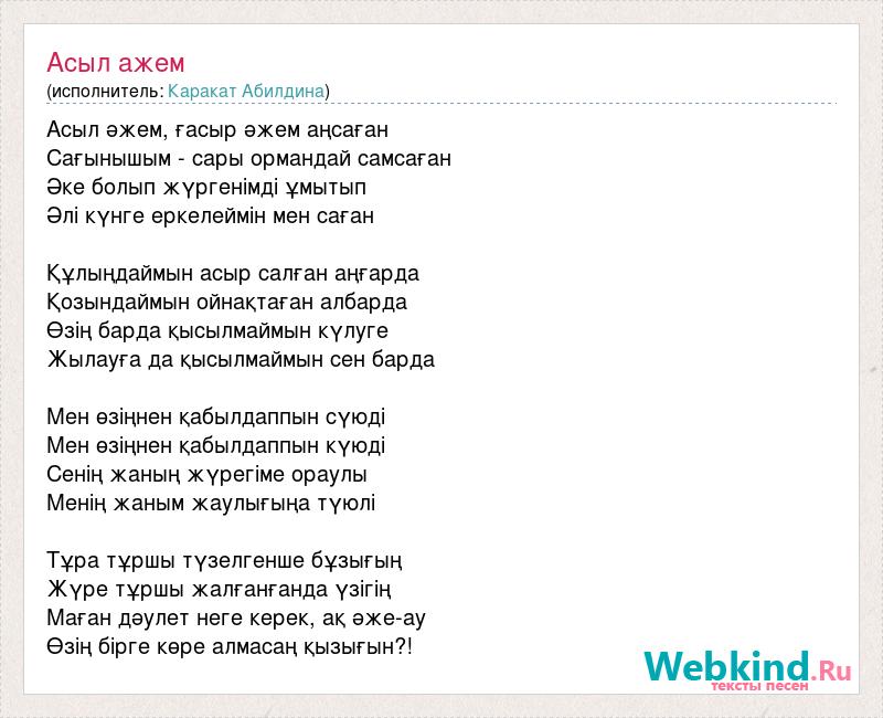 Асыл әжем, ғасыр әжем аңсаған Сағынышым - сары ормандай самсаған Әке болып жүргенімді ұмытып Әлі күнге еркелеймін мен саған Құлыңдаймын асыр салған аңғарда Қозындаймын ойнақтаған албарда Өзің барда қысылмаймын күлуге Жылауға да қысылмаймын сен барда Мен өзіңнен қабылдаппын сүюді Мен өзіңнен қабылдаппын күюді Сенің жаның жүрегіме ораулы Менің жаным жаулығыңа түюлі Тұра тұршы түзелгенше бұзығың Жүре тұршы жалғанғанда үзігің Маған дәулет неге керек, ақ әже-ау Өзің бірге көре алмасаң қызығын?!