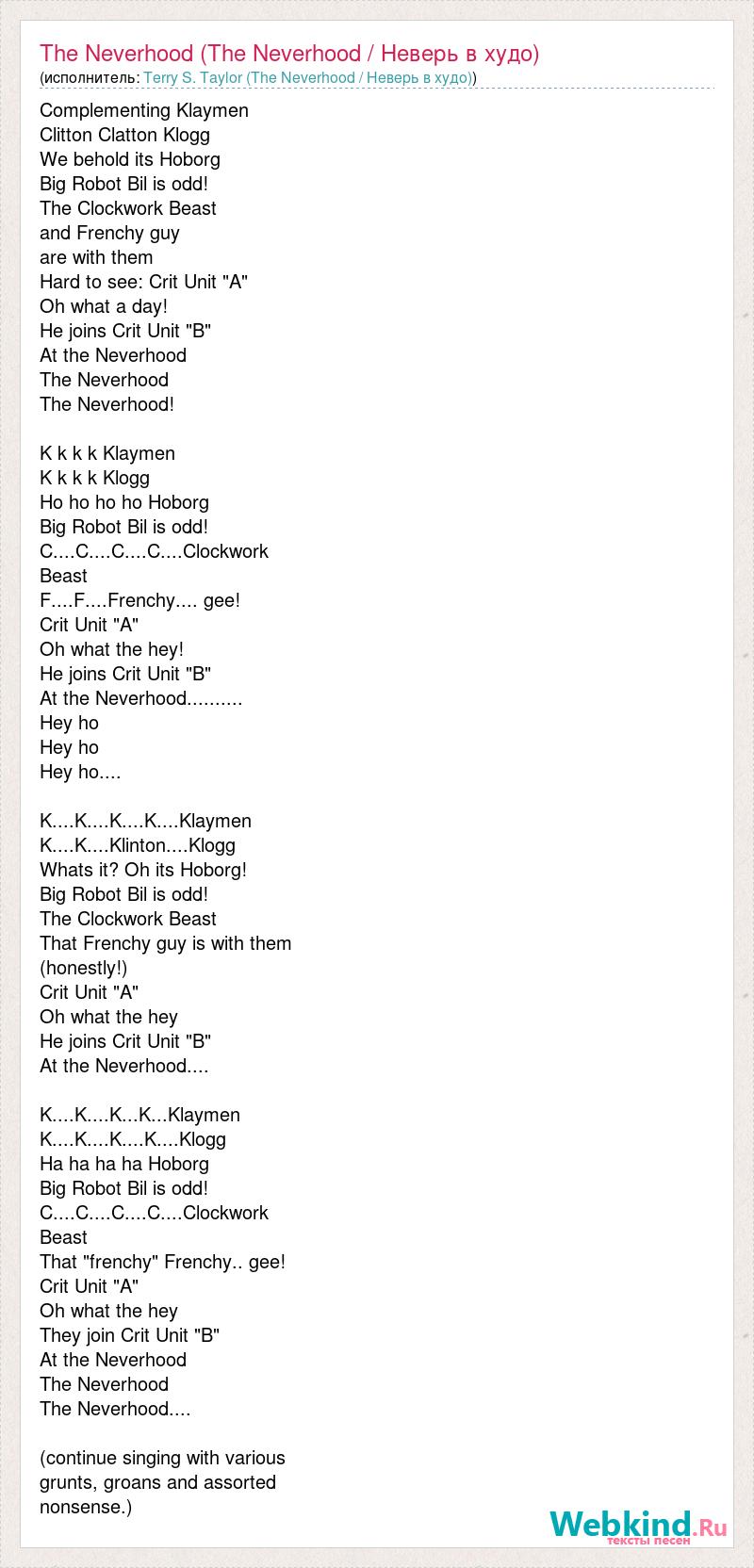 Complementing Klaymen Clitton Clatton Klogg We behold its Hoborg Big Robot Bil is odd! The Clockwork Beast and Frenchy guy are with them Hard to see: Crit Unit "A" Oh what a day! He joins Crit Unit "B" At the Neverhood The Neverhood The Neverhood! K k k k Klaymen K k k k Klogg Ho ho ho ho Hoborg Big Robot Bil is odd! C....C....C....C....Clockwork Beast F....F....Frenchy.... gee! Crit Unit "A" Oh what the hey! He joins Crit Unit "B" At the Neverhood.......... Hey ho Hey ho Hey ho.... K....K....K....K....Klaymen K....K....Klinton....Klogg Whats it? Oh its Hoborg! Big Robot Bil is odd! The Clockwork Beast That Frenchy guy is with them (honestly!) Crit Unit "A" Oh what the hey He joins Crit Unit "B" At the Neverhood.... K....K....K...K...Klaymen K....K....K....K....Klogg Ha ha ha ha Hoborg Big Robot Bil is odd! C....C....C....C....Clockwork Beast That "frenchy" Frenchy.. gee! Crit Unit "A" Oh what the hey They join Crit Unit "B" At the Neverhood The Neverhood The Neverhood.... (continue singing with various grunts, groans and assorted nonsense.)