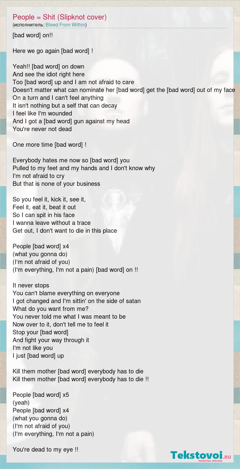 Come on!! Here we go again [bad word] ! Yeah!! Come on down And see the idiot right here Too [bad word] up and I am not afraid to care Doesn't matter what can nominate her anyway Run get the [bad word] out of my face On a turn and I can't feel anything It isn't nothing but a self that can decay I feel like I'm wounded And I got a [bad word] gun against my head You're never not dead One more time [bad word] ! Everybody hates me now so [bad word] you Pulled to my feet and my hands and I don't know why I'm not afraid to cry But that is none of your business So you feel it, kick it, see it, Feel it, eat it, beat it out So I can spit in his face I wanna leave without a trace Get out, I don't want to die in this place People [bad word] x4 (what you gonna do) (I'm not afraid of you) (I'm everything, I'm not a pain) Come on !! It never stops You can't blame everything on everyone I got changed and I'm sittin' on the side of satan What do you want from me? You never told me what I was meant to be Now over to it, don't tell me to feel it Stop your [bad word] And fight your way through it I'm not like you I just [bad word] up Kill them mother [bad word] everybody has to die Kill them mother [bad word] everybody has to die !! People [bad word] x5 (yeah) People [bad word] x4 (what you gonna do) (I'm not afraid of you) (I'm everything, I'm not a pain) You're dead to my eye !!