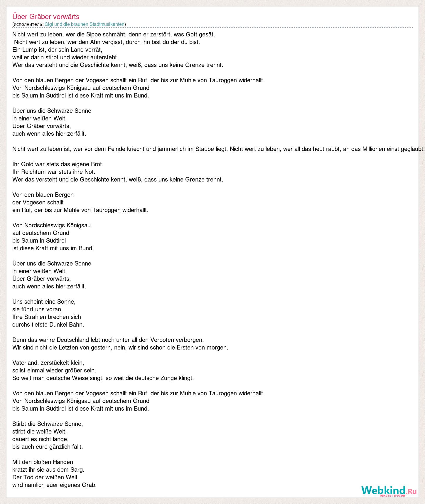 Nicht wert zu leben, wer die Sippe schmäht, denn er zerstört, was Gott gesät. Nicht wert zu leben, wer den Ahn vergisst, durch ihn bist du der du bist. Ein Lump ist, der sein Land verrät, weil er darin stirbt und wieder aufersteht. Wer das versteht und die Geschichte kennt, weiß, dass uns keine Grenze trennt. Von den blauen Bergen der Vogesen schallt ein Ruf, der bis zur Mühle von Tauroggen widerhallt. Von Nordschleswigs Königsau auf deutschem Grund bis Salurn in Südtirol ist diese Kraft mit uns im Bund. Über uns die Schwarze Sonne in einer weißen Welt. Über Gräber vorwärts, auch wenn alles hier zerfällt. Nicht wert zu leben ist, wer vor dem Feinde kriecht und jämmerlich im Staube liegt. Nicht wert zu leben, wer all das heut raubt, an das Millionen einst geglaubt. Ihr Gold war stets das eigene Brot. Ihr Reichtum war stets ihre Not. Wer das versteht und die Geschichte kennt, weiß, dass uns keine Grenze trennt. Von den blauen Bergen der Vogesen schallt ein Ruf, der bis zur Mühle von Tauroggen widerhallt. Von Nordschleswigs Königsau auf deutschem Grund bis Salurn in Südtirol ist diese Kraft mit uns im Bund. Über uns die Schwarze Sonne in einer weißen Welt. Über Gräber vorwärts, auch wenn alles hier zerfällt. Uns scheint eine Sonne, sie führt uns voran. Ihre Strahlen brechen sich durchs tiefste Dunkel Bahn. Denn das wahre Deutschland lebt noch unter all den Verboten verborgen. Wir sind nicht die Letzten von gestern, nein, wir sind schon die Ersten von morgen. Vaterland, zerstückelt klein, sollst einmal wieder größer sein. So weit man deutsche Weise singt, so weit die deutsche Zunge klingt. Von den blauen Bergen der Vogesen schallt ein Ruf, der bis zur Mühle von Tauroggen widerhallt. Von Nordschleswigs Königsau auf deutschem Grund bis Salurn in Südtirol ist diese Kraft mit uns im Bund. Stirbt die Schwarze Sonne, stirbt die weiße Welt, dauert es nicht lange, bis auch eure gänzlich fällt. Mit den bloßen Händen kratzt ihr sie aus dem Sarg. Der Tod der weißen Welt wird nämlich euer eigenes Grab.