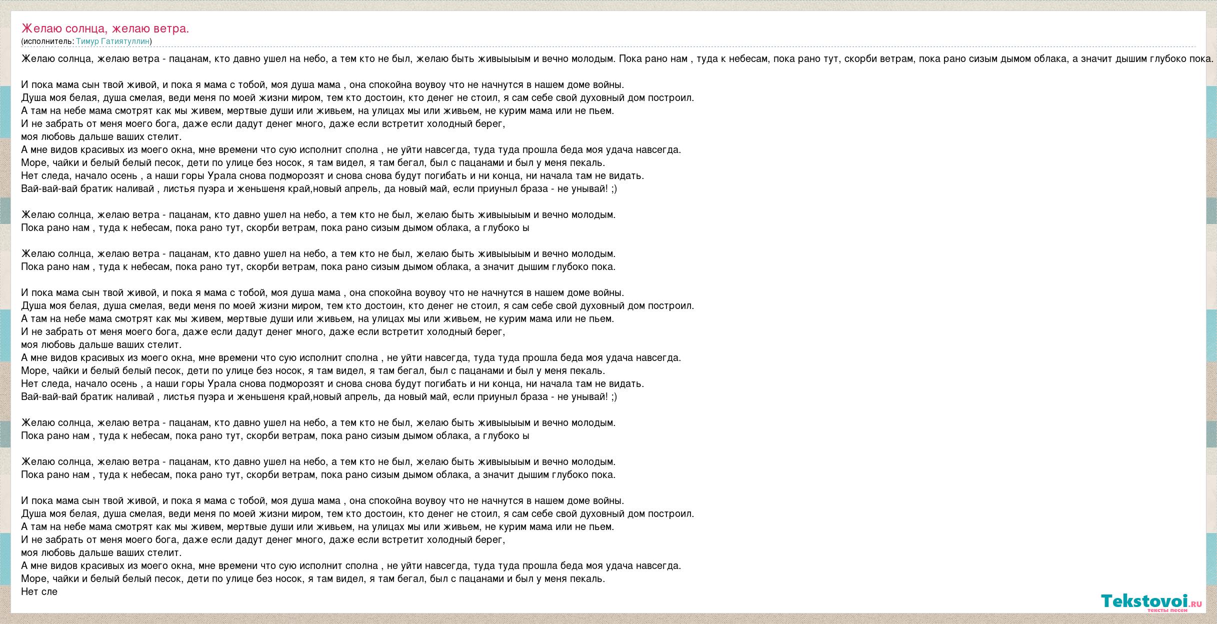 Желаю солнца, желаю ветра - пацанам, кто давно ушел на небо, а тем кто не был, желаю быть живыыыым и вечно молодым. Пока рано нам , туда к небесам, пока рано тут, скорби ветрам, пока рано сизым дымом облака, а значит дышим глубоко пока. И пока мама сын твой живой, и пока я мама с тобой, моя душа мама , она спокойна воувоу что не начнутся в нашем доме войны. Душа моя белая, душа смелая, веди меня по моей жизни миром, тем кто достоин, кто денег не стоил, я сам себе свой духовный дом построил. А там на небе мама смотрят как мы живем, мертвые души или живьем, на улицах мы или живьем, не курим мама или не пьем. И не забрать от меня моего бога, даже если дадут денег много, даже если встретит холодный берег, моя любовь дальше ваших стелит. А мне видов красивых из моего окна, мне времени что сую исполнит сполна , не уйти навсегда, туда туда прошла беда моя удача навсегда. Море, чайки и белый белый песок, дети по улице без носок, я там видел, я там бегал, был с пацанами и был у меня пекаль. Нет следа, начало осень , а наши горы Урала снова подморозят и снова снова будут погибать и ни конца, ни начала там не видать. Вай-вай-вай братик наливай , листья пуэра и женьшеня край,новый апрель, да новый май, если приуныл браза - не унывай! ;) Желаю солнца, желаю ветра - пацанам, кто давно ушел на небо, а тем кто не был, желаю быть живыыыым и вечно молодым. Пока рано нам , туда к небесам, пока рано тут, скорби ветрам, пока рано сизым дымом облака, а глубоко ы Желаю солнца, желаю ветра - пацанам, кто давно ушел на небо, а тем кто не был, желаю быть живыыыым и вечно молодым. Пока рано нам , туда к небесам, пока рано тут, скорби ветрам, пока рано сизым дымом облака, а значит дышим глубоко пока. И пока мама сын твой живой, и пока я мама с тобой, моя душа мама , она спокойна воувоу что не начнутся в нашем доме войны. Душа моя белая, душа смелая, веди меня по моей жизни миром, тем кто достоин, кто денег не стоил, я сам себе свой духовный дом построил. А там на небе мама смотрят как мы живем, мертвые души или живьем, на улицах мы или живьем, не курим мама или не пьем. И не забрать от меня моего бога, даже если дадут денег много, даже если встретит холодный берег, моя любовь дальше ваших стелит. А мне видов красивых из моего окна, мне времени что сую исполнит сполна , не уйти навсегда, туда туда прошла беда моя удача навсегда. Море, чайки и белый белый песок, дети по улице без носок, я там видел, я там бегал, был с пацанами и был у меня пекаль. Нет следа, начало осень , а наши горы Урала снова подморозят и снова снова будут погибать и ни конца, ни начала там не видать. Вай-вай-вай братик наливай , листья пуэра и женьшеня край,новый апрель, да новый май, если приуныл браза - не унывай! ;) Желаю солнца, желаю ветра - пацанам, кто давно ушел на небо, а тем кто не был, желаю быть живыыыым и вечно молодым. Пока рано нам , туда к небесам, пока рано тут, скорби ветрам, пока рано сизым дымом облака, а глубоко ы Желаю солнца, желаю ветра - пацанам, кто давно ушел на небо, а тем кто не был, желаю быть живыыыым и вечно молодым. Пока рано нам , туда к небесам, пока рано тут, скорби ветрам, пока рано сизым дымом облака, а значит дышим глубоко пока. И пока мама сын твой живой, и пока я мама с тобой, моя душа мама , она спокойна воувоу что не начнутся в нашем доме войны. Душа моя белая, душа смелая, веди меня по моей жизни миром, тем кто достоин, кто денег не стоил, я сам себ