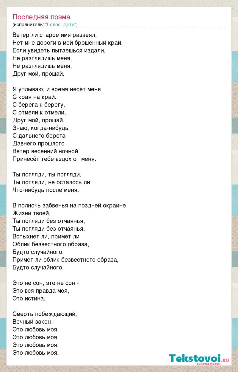 Ветер ли старое имя развеял, Нет мне дороги в мой брошенный край. Если увидеть пытаешься издали, Не разглядишь меня, Не разглядишь меня, Друг мой, прощай. Я уплываю, и время несёт меня С края на край. С берега к берегу, С отмели к отмели, Друг мой, прощай. Знаю, когда-нибудь С дальнего берега Давнего прошлого Ветер весенний ночной Принесёт тебе вздох от меня. Ты погляди, ты погляди, Ты погляди, не осталось ли Что-нибудь после меня. В полночь забвенья на поздней окраине Жизни твоей, Ты погляди без отчаянья, Ты погляди без отчаянья. Вспыхнет ли, примет ли Облик безвестного образа, Будто случайного. Примет ли облик безвестного образа, Будто случайного. Это не сон, это не сон - Это вся правда моя, Это истина. Смерть побеждающий, Вечный закон - Это любовь моя. Это любовь моя. Это любовь моя. Это любовь моя.