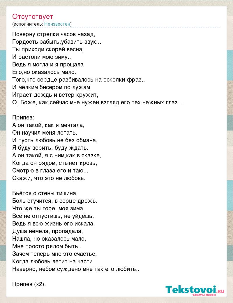 Поверну стрелки часов назад, Гордость забыть,убавить звук... Ты приходи скорей весна, И растопи мою зиму.. Ведь я могла и я прощала Его,но оказалось мало. Того,что сердце разбивалось на осколки фраз.. И мелким бисером по лужам Играет дождь и ветер кружит, О, Боже, как сейчас мне нужен взгляд его тех нежных глаз... Припев: А он такой, как я мечтала, Он научил меня летать. И пусть любовь не без обмана, Я буду верить, буду ждать. А он такой, я с ним,как в сказке, Когда он рядом, стынет кровь, Смотрю в глаза его и таю... Скажи, что это не любовь. Бьётся о стены тишина, Боль стучится, в серце дрожь. Что же ты горе, моя зима, Всё не отпустишь, не уйдёшь. Ведь я всю жизнь его искала, Душа немела, пропадала, Нашла, но оказалось мало, Мне просто рядом быть.. Зачем теперь мне это счастье, Когда любовь летит на части Наверно, небом суждено мне так его любить.. Припев (х2).