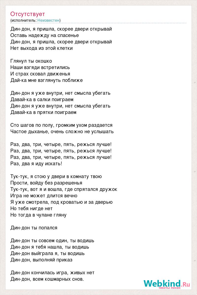 Дин-дон, я пришла, скорее двери открывай Оставь надежду на спасенье Дин-дон, я пришла, скорее двери открывай Нет выхода из этой клетки Глянул ты окошко Наши взгяди встретились И страх сковал движенья Дай-ка мне взглянуть поближе Дин-дон я уже внутри, нет смысла убегать Давай-ка в салки поиграем Дин-дон я уже внутри, нет смысла убегать Давай-ка в прятки поиграем Сто шагов по полу, громким ухом раздается Частое дыханье, очень сложно не услышать Раз, два, три, четыре, пять, режься лучше! Раз, два, три, четыре, пять, режься лучше! Раз, два, три, четыре, пять, режься лучше! Раз, два я иду искать! Тук-тук, я стою у двери в комнату твою Прости, войду без разрешенья Тук-тук, вот я и вошла, где спрятался дружок Игра не может длится вечно Я уже смотрела, под кроватью и за дверью Но тебя нигде нет Но тогда в чулане гляну Дин-дон ты попался Дин-дон ты совсем один, ты водишь Дин-дон я тебя нашла, ты водишь Дин-дон выйграла я, ты водишь Дин-дон, выполняй приказ Дин-дон кончилась игра, живых нет Дин-дон, всем кошмарных снов.