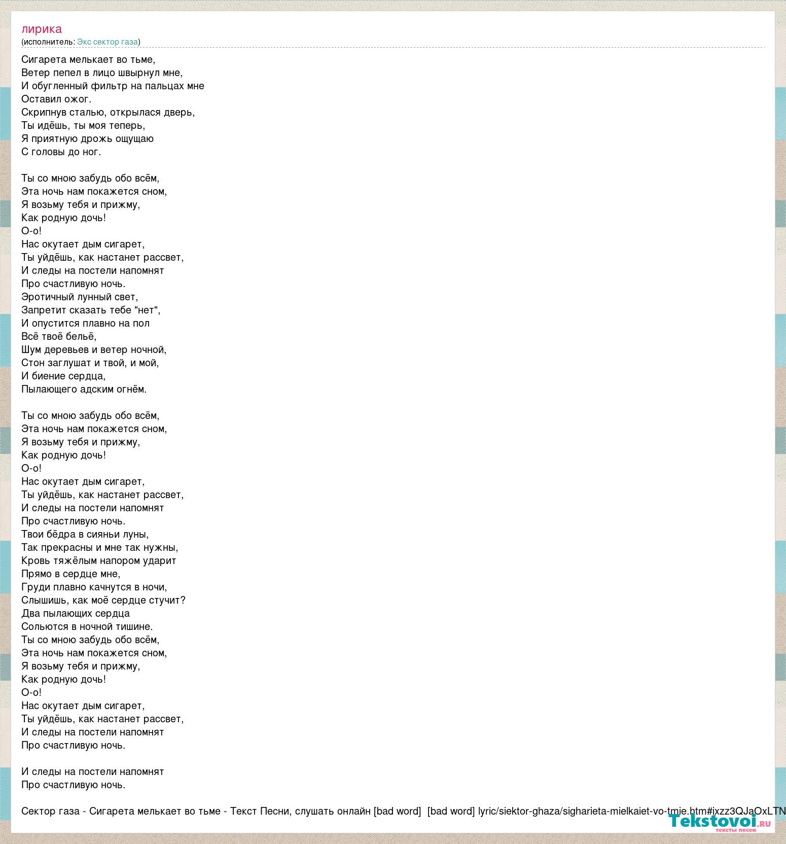 Сигарета мелькает во тьме, Ветер пепел в лицо швырнул мне, И обугленный фильтр на пальцах мне Оставил ожог. Скрипнув сталью, открылася дверь, Ты идёшь, ты моя теперь, Я приятную дрожь ощущаю С головы до ног. Ты со мною забудь обо всём, Эта ночь нам покажется сном, Я возьму тебя и прижму, Как родную дочь! О-о! Hас окутает дым сигарет, Ты уйдёшь, как настанет рассвет, И следы на постели напомнят Про счастливую ночь. Эротичный лунный свет, Запретит сказать тебе "нет", И опустится плавно на пол Всё твоё бельё, Шум деревьев и ветер ночной, Стон заглушат и твой, и мой, И биение сердца, Пылающего адским огнём. Ты со мною забудь обо всём, Эта ночь нам покажется сном, Я возьму тебя и прижму, Как родную дочь! О-о! Hас окутает дым сигарет, Ты уйдёшь, как настанет рассвет, И следы на постели напомнят Про счастливую ночь. Твои бёдра в сияньи луны, Так прекрасны и мне так нужны, Кровь тяжёлым напором ударит Прямо в сердце мне, Груди плавно качнутся в ночи, Слышишь, как моё сердце стучит? Два пылающих сердца Сольются в ночной тишине. Ты со мною забудь обо всём, Эта ночь нам покажется сном, Я возьму тебя и прижму, Как родную дочь! О-о! Hас окутает дым сигарет, Ты уйдёшь, как настанет рассвет, И следы на постели напомнят Про счастливую ночь. И следы на постели напомнят Про счастливую ночь. Сектор газа - Сигарета мелькает во тьме - Текст Песни, слушать онлайн [bad word] [bad word] lyric/siektor-ghaza/sigharieta-mielkaiet-vo-tmie.htm#ixzz3QJaOxLTN