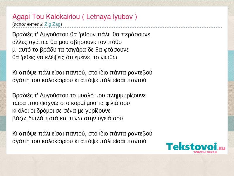 А как ты думаешь, о чем песня "Agapi Tou Kalokairiou ( Letnaya lyubov )" ?