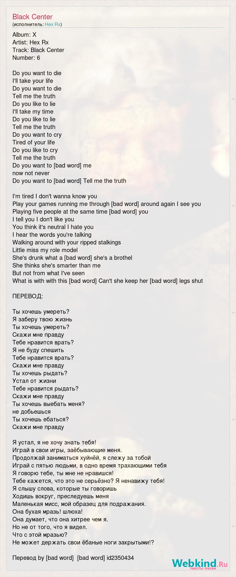 Album: X Artist: Hex Rx Track: Black Center Number: 6 Do you want to die I'll take your life Do you want to die Tell me the truth Do you like to lie I'll take my time Do you like to lie Tell me the truth Do you want to cry Tired of your life Do you like to cry Tell me the truth Do you want to [bad word] me now not never Do you want to [bad word] Tell me the truth I'm tired I don't wanna know you Play your games running me through [bad word] around again I see you Playing five people at the same time [bad word] you I tell you I don't like you You think it's neutral I hate you I hear the words you're talking Walking around with your ripped stalkings Little miss my role model She's drunk what a [bad word] she's a brothel She thinks she's smarter than me But not from what I've seen What is with with this [bad word] Can't she keep her [bad word] legs shut ПЕРЕВОД: Ты хочешь умереть? Я заберу твою жизнь Ты хочешь умереть? Скажи мне правду Тебе нравится врать? Я не буду спешить Тебе нравится врать? Скажи мне правду Ты хочешь рыдать? Устал от жизни Тебе нравится рыдать? Скажи мне правду Ты хочешь выебать меня? не добьешься Ты хочешь ебаться? Скажи мне правду Я устал, я не хочу знать тебя! Играй в свои игры, заёбывающие меня. Продолжай заниматься хуйнёй, я слежу за тобой Играй с пятью людьми, в одно время трахающими тебя Я говорю тебе, ты мне не нравишся! Тебе кажется, что это не серьёзно? Я ненавижу тебя! Я слышу слова, которые ты говоришь Ходишь вокруг, преследуешь меня Маленькая мисс, мой образец для подражания. Она бухая мразь! шлюха! Она думает, что она хитрее чем я. Но не от того, что я видел. Что с этой мразью? Не может держать свои ёбаные ноги закрытыми!? Перевод by [bad word] [bad word] id2350434